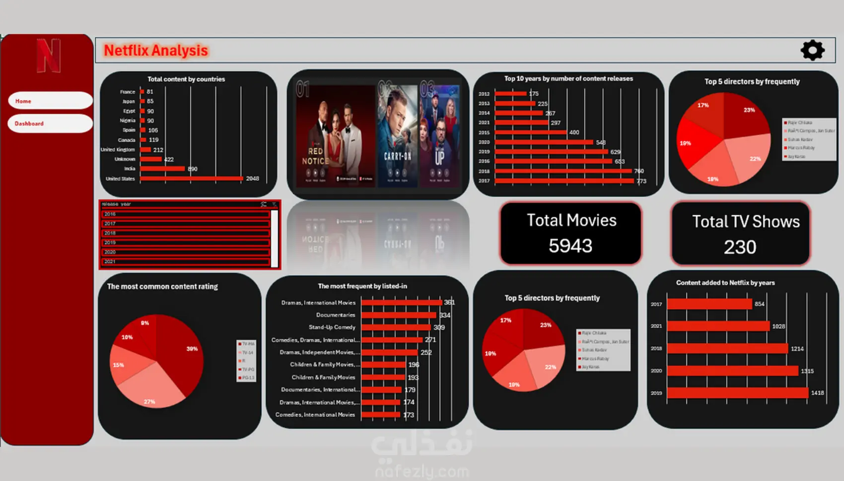 ت بإنشاء لوحة تحكم تفاعلية لتحليل أفلام ومسلسلات Netflix. تعرض اللوحة توزيع المحتوى حسب الدولة، سنة الإصدار، النوع (Genres)، التقييمات، وأشهر المخرجين.