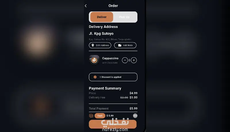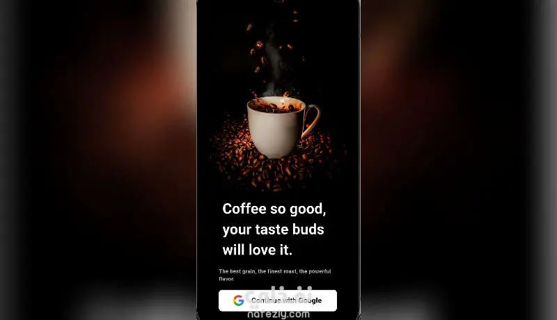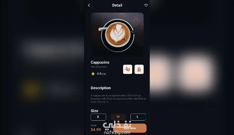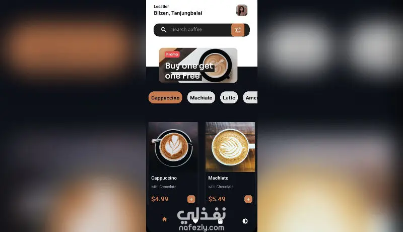 تطبيق موبايل أنيق يعرض واجهة مقهى عصرية بتصميم جميل وعناصر تفاعلية جذّابة.