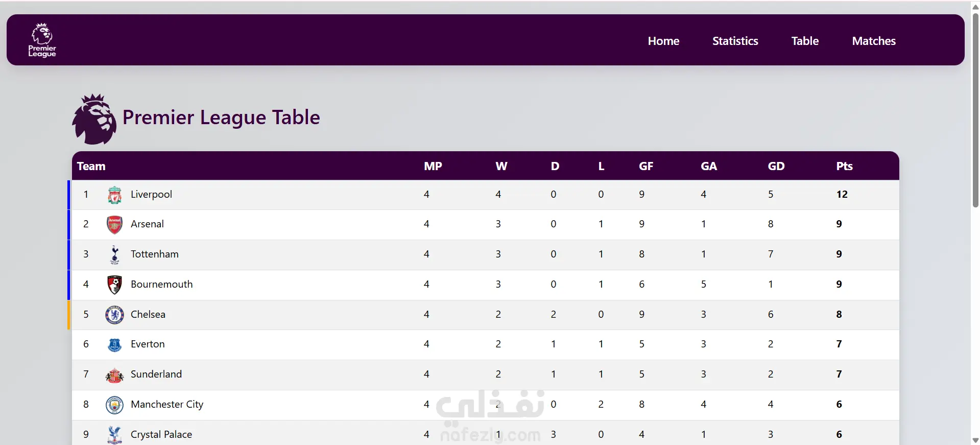 قمت بإنشاء صفحة ويب لعرض جدول ترتيب الدوري الإنجليزي باستخدام HTML, CSS, JavaScript, Bootstrap, jQuery و Ajax.