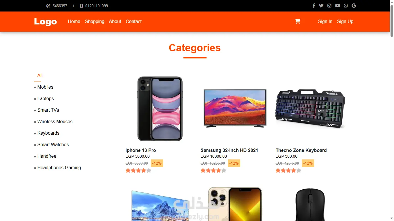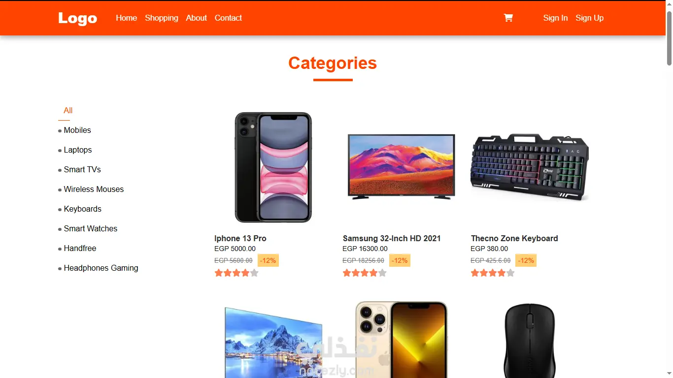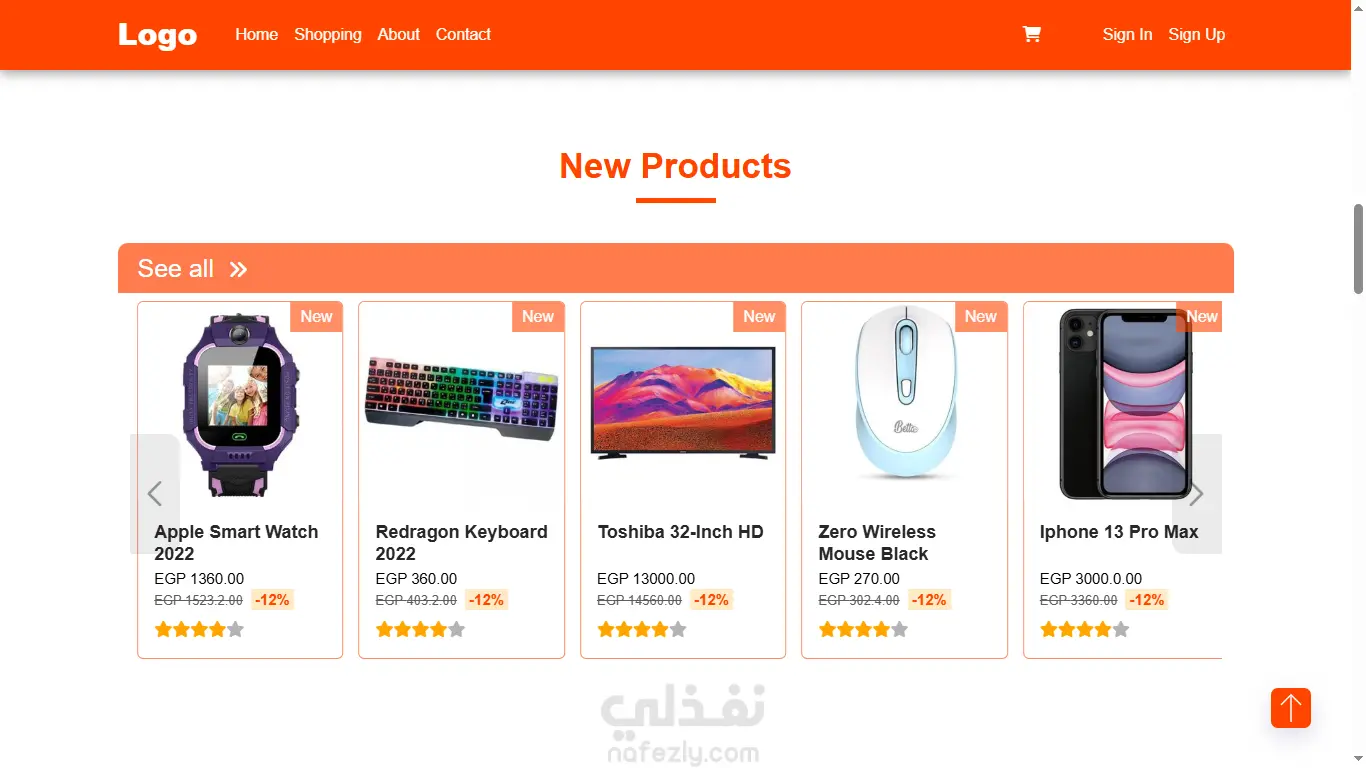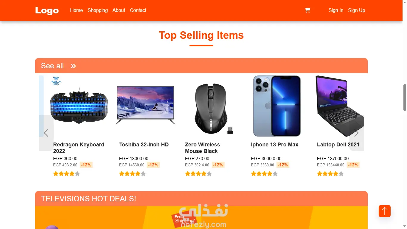 نوع العمل: موقع إلكتروني للتجارة الإلكترونية (E-commerce) لعرض وبيع المنتجات عبر الإنترنت، ضمن مشروع تخرج من كورس ITI 2022. الميزات: يتميز الموقع بواجهة مستخدم جذابة ومتجاوبة، إمكانية تصفح المنتجات، إضافة المنتجات إلى السلة، عرض تفاصيل المنتجات، والتنقل بين الصفحات بسهولة. طريقة التنفيذ: تم استخدام React لبناء واجهة المستخدم التفاعلية، Bootstrap 5 لتصميم العناصر بشكل متجاوب، دوري في المشروع: كنت مسؤولًا عن تطوير الواجهة الأمامية (Front-end) فقط، باستخدام React، Bootstrap 5، وSwiper لإضافة التفاعلات وحركة التمرير بين العناصر.