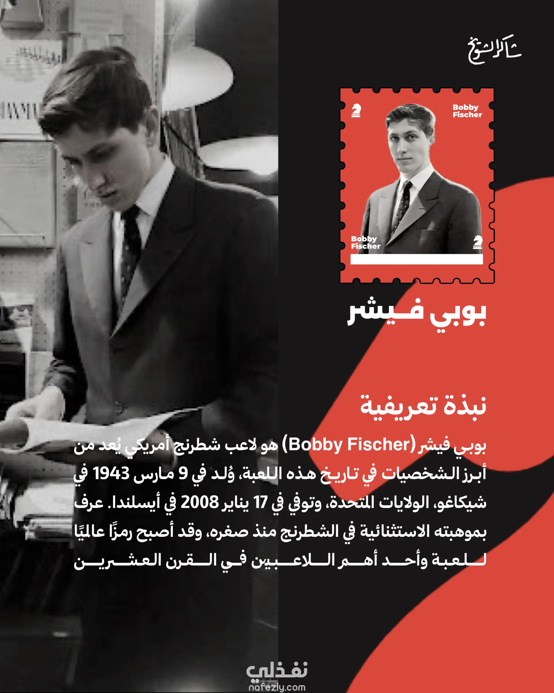 صورة تاريخية بالأبيض والأسود لبوبي فيشر وهو شاب، تعزز الطابع الكلاسيكي للتصميم، وتعطي إحساسًا بالزمن والمكان.
