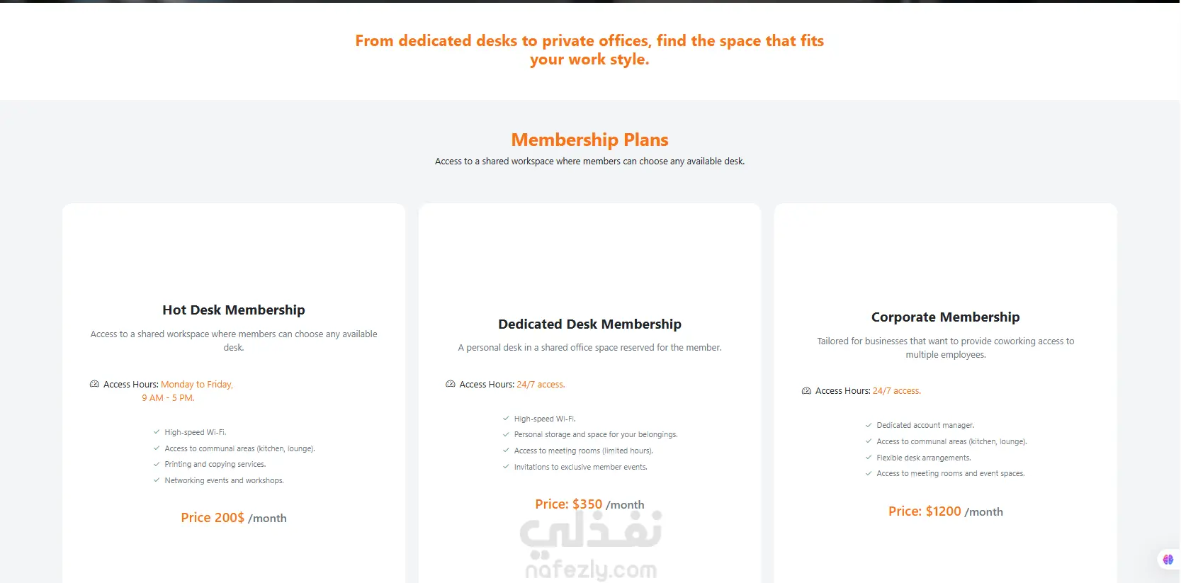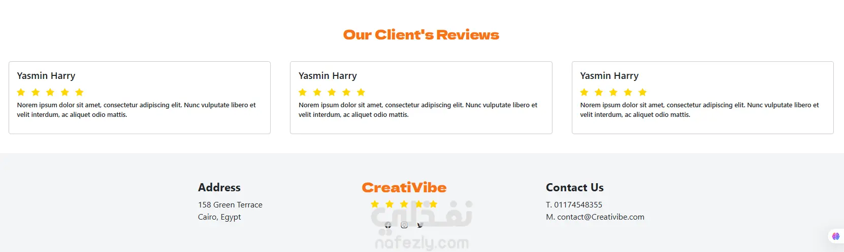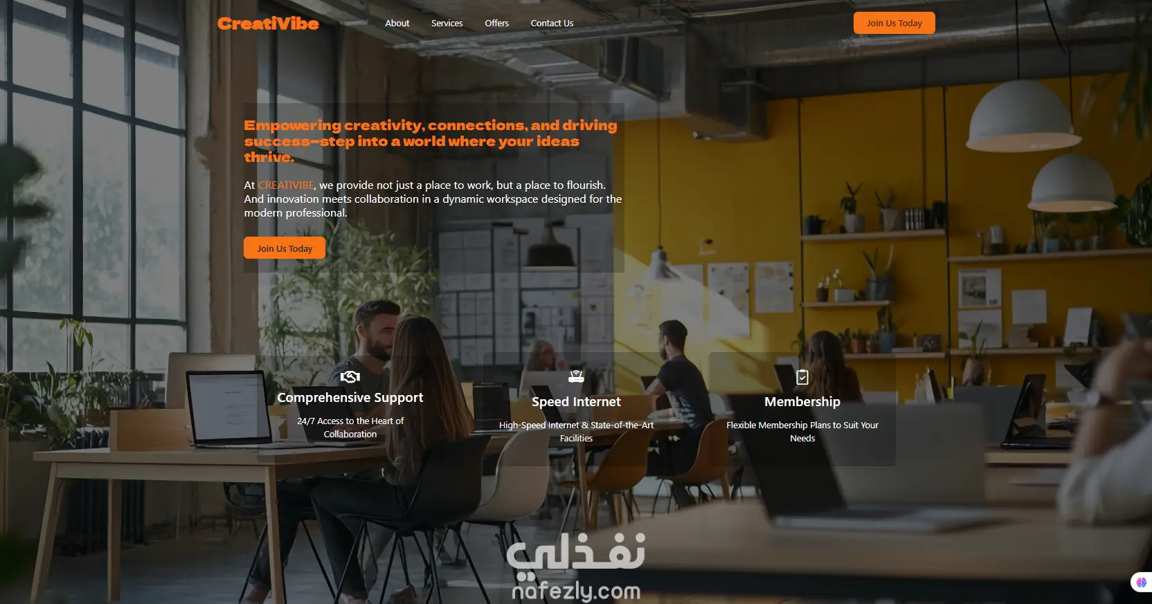 الموقع ده عبارة عن صفحة تعريفية لشركة أو مساحة عمل مشتركة باسم CreatiViba، معمول باستخدام HTML وCSS/Bootstrap مع شوية جافاسكريبت، ومستضاف على GitHub Pages. بيتكون من أقسام واضحة: الهيدر فيه روابط للتنقل بين الأجزاء، وبعده بانر ترحيبي بدعوة للانضمام. بعد كده فيه قسم للخدمات والمميزات زي الدعم المتواصل والإنترنت السريع، وقسم لخطط العضوية بأنواعها (Hot Desk, Dedicated Desk, Corporate) مع تفاصيل كل خطة. كمان فيه معرض صور (Gallery) للتعريف بالمكان، وقسم About Us بيشرح رسالة الشركة وفريقها، بالإضافة إلى جزء خاص بآراء العملاء (Reviews). في الآخر بيظهر قسم للتواصل فيه العنوان ووسائل الاتصال. الهدف من الموقع هو عرض الشركة وخدماتها بشكل منظم واحترافي لجذب العملاء.