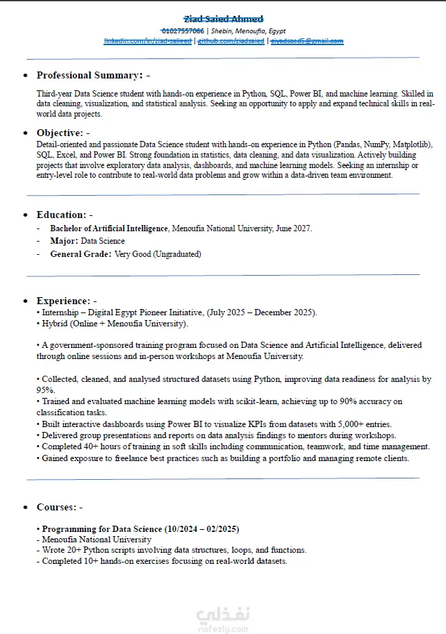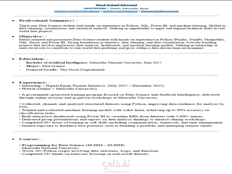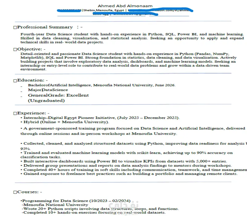 سأقوم بإنشاء سيرة ذاتية (CV) احترافية مصممة بشكل جذاب ومنسق تساعدك على إبراز خبراتك ومهاراتك أمام أصحاب العمل. الخدمة الأساسية تشمل: تصميم وإنشاء سيرة ذاتية من صفحتين كحد أقصى. بلغة واحدة فقط (العربية أو الإنجليزية). تسليم بصيغة PDF جاهزة للطباعة والإرسال. مميزات الخدمة تصميم احترافي تنسيق حديث وجذاب يلفت انتباه مسؤولي التوظيف. متوافق مع ATS اجتياز أنظمة فحص السير الذاتية بسهولة. لغتان متاحتان إمكانية إعداد السيرة بالعربية أو الإنجليزية. تركيز على نقاط القوة إبراز مهاراتك وخبراتك بشكل واضح ومؤثر.