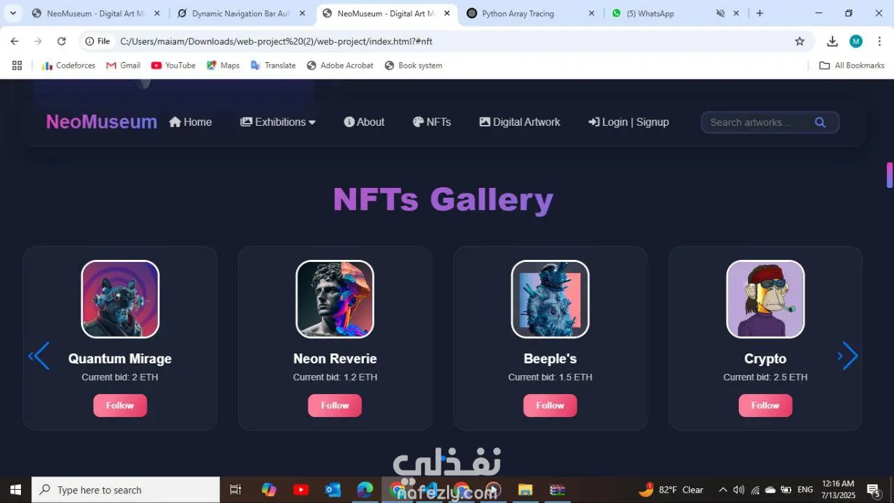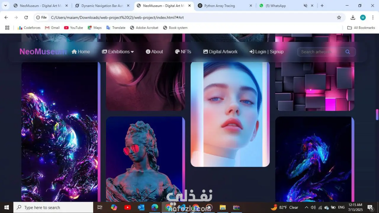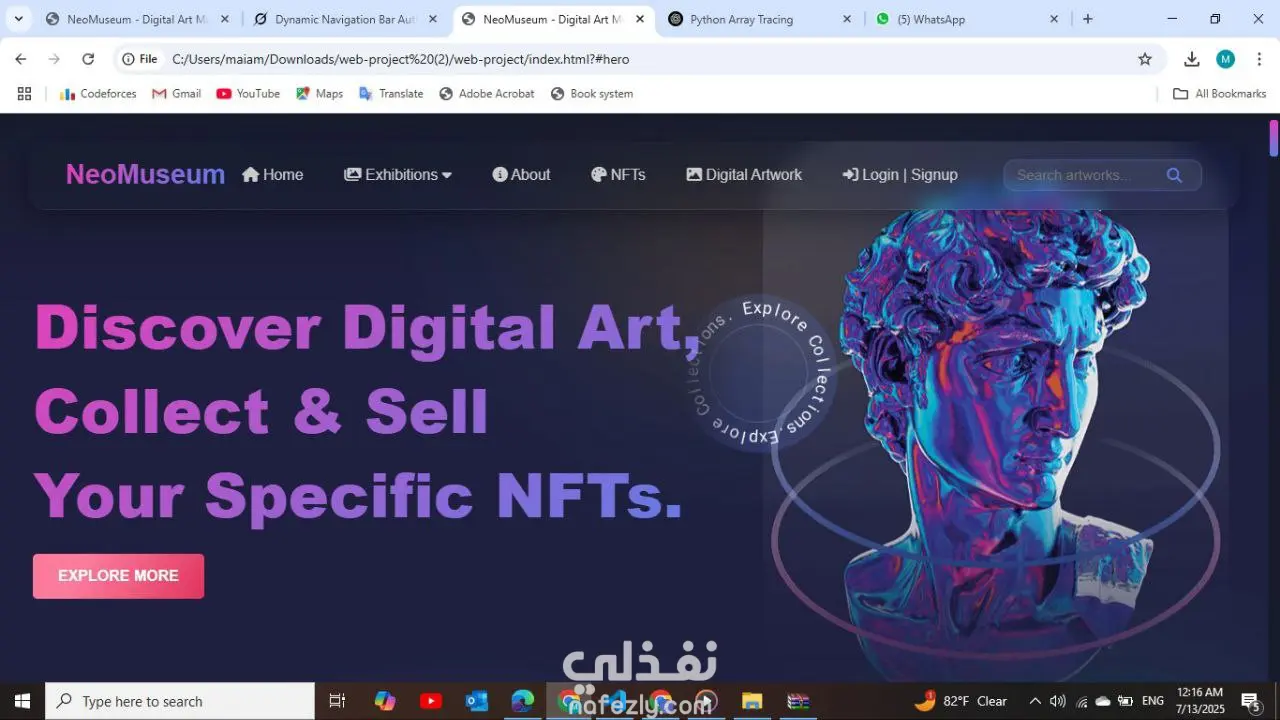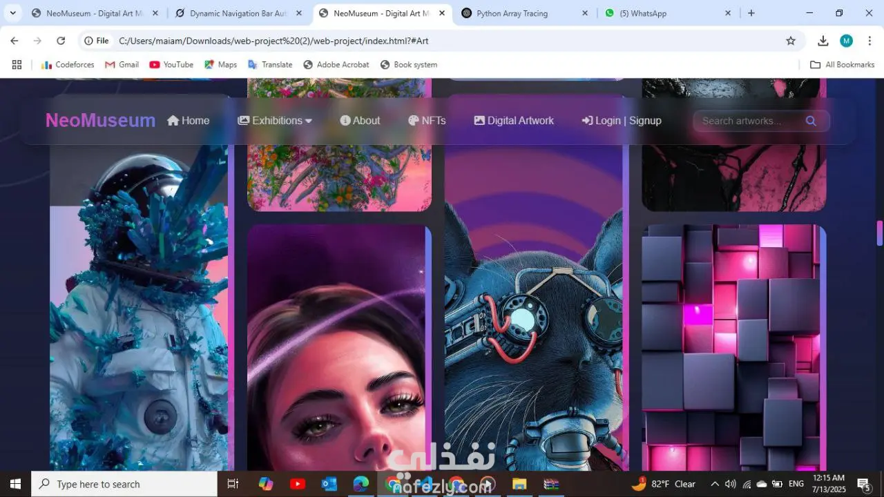 A designed and developed a responsive digital art museum website called NeoMuseum using HTML, CSS, and JavaScript. The website allows users to discover, collect, and showcase digital artworks and NFTs in a modern, visually appealing interface.