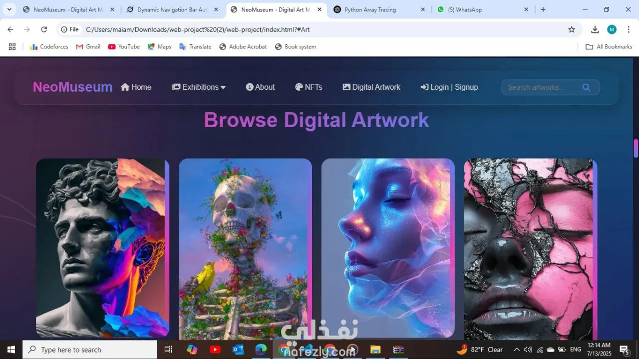 Sections for Exhibitions, NFTs, Digital Artwork, and Login/Signup functionality.