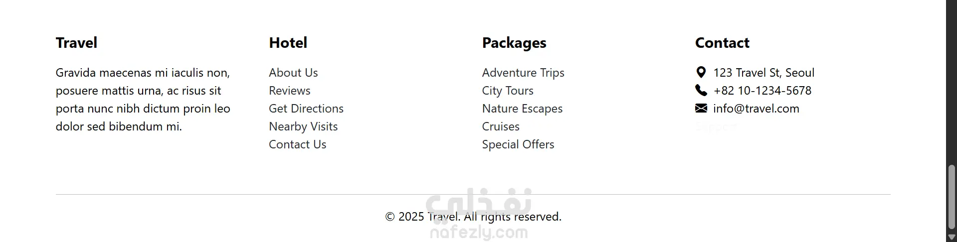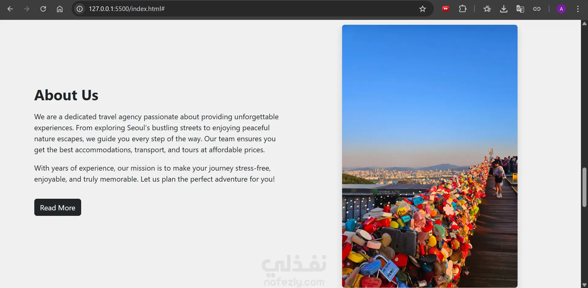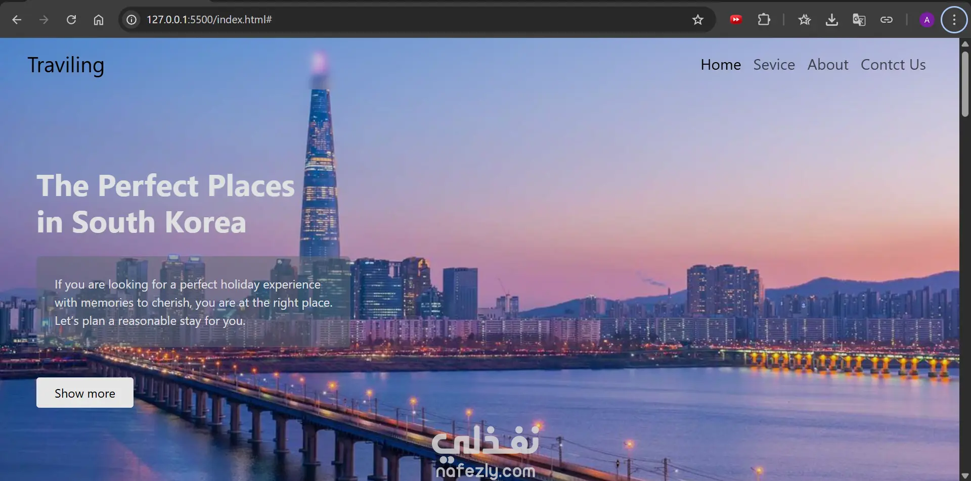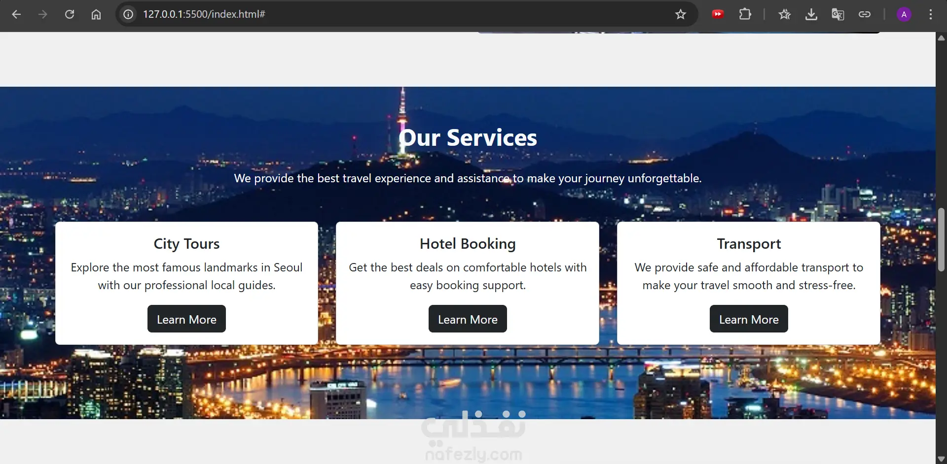 A modern and responsive landing page designed for a travel and tourism website. The page showcases beautiful destinations, travel offers, and company details using an attractive and user-friendly interface. It includes sections such as Hero, About, Popular Destinations, Testimonials, and a Contact Form.