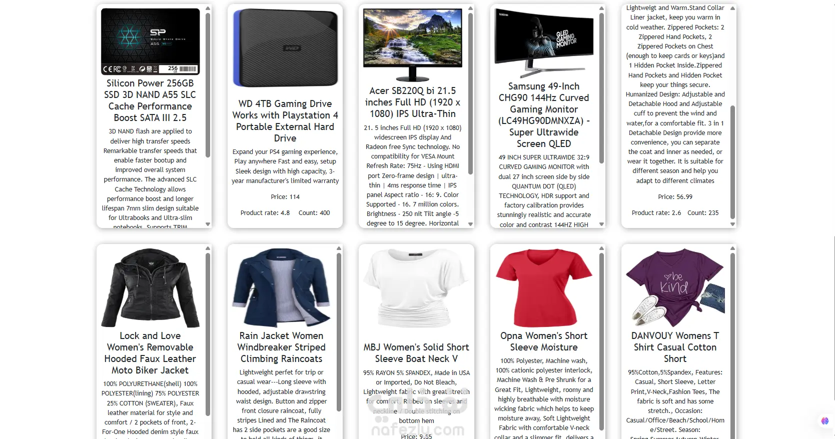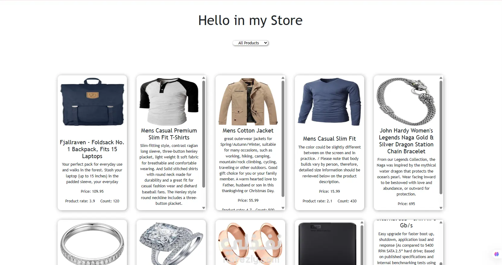 الموقع ده عبارة عن صفحة متجر بسيطة معمولة باستخدام HTML وCSS/Bootstrap، وبيعتمد على JavaScript لجلب بيانات المنتجات باستخدام دالة fetch من ملف أو مصدر خارجي. بعد ما بتتجلب البيانات، الموقع بيعرضها في شكل بطاقات (Cards)، وكل بطاقة فيها صورة المنتج واسمه وسعره مع إمكانية إضافة زرار للتفاصيل أو الشراء. التصميم معمول بنظام شبكة (Grid) عشان يخلّي عرض المنتجات منظم وسهل التصفح. الهدف من الموقع إنه يكون نموذج عملي لعرض المنتجات أونلاين مع تطبيق فكرة جلب البيانات ديناميكيًا بالـ fetch بدل ما تكون مكتوبة يدويًا في الكود.