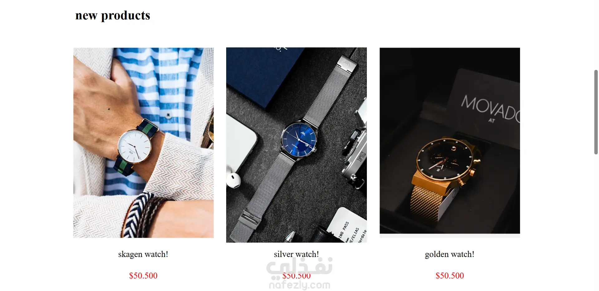 موقعًا عصريًا ومتجاوبًا للساعات بواجهة نظيفة لعرض المنتجات. يتضمن بطاقات منتجات تحتوي على صور، أسعار، ووصف لكل منتج، بالإضافة إلى فلاتر للتصنيفات. حافظ على أن يكون التصميم أنيقًا، بسيطًا، وسهل الاستخدام عبر جميع الأجهزة.