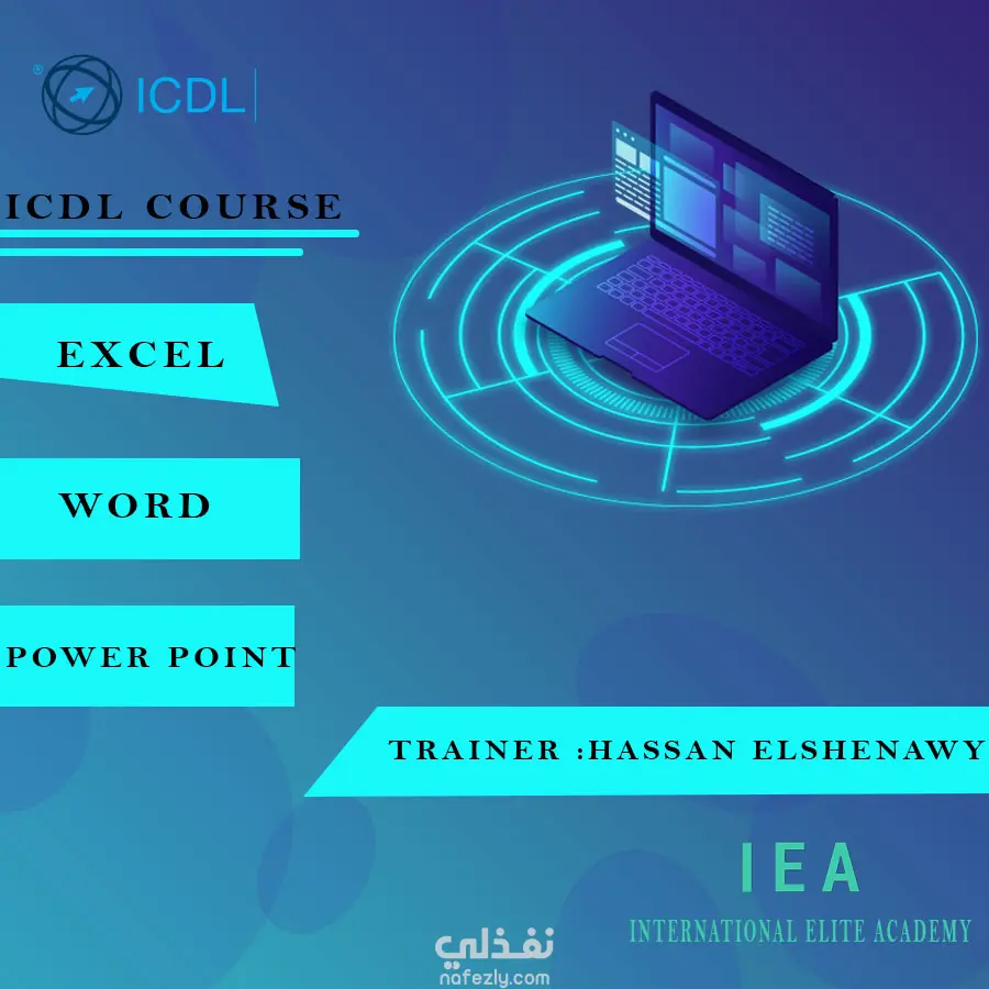ICDL course training design featuring Excel, Word, and PowerPoint modules. Modern tech aesthetic with 3D laptop visual and digital elements. Trainer: Hassan Elshenawy - International Elite Academy (IEA).