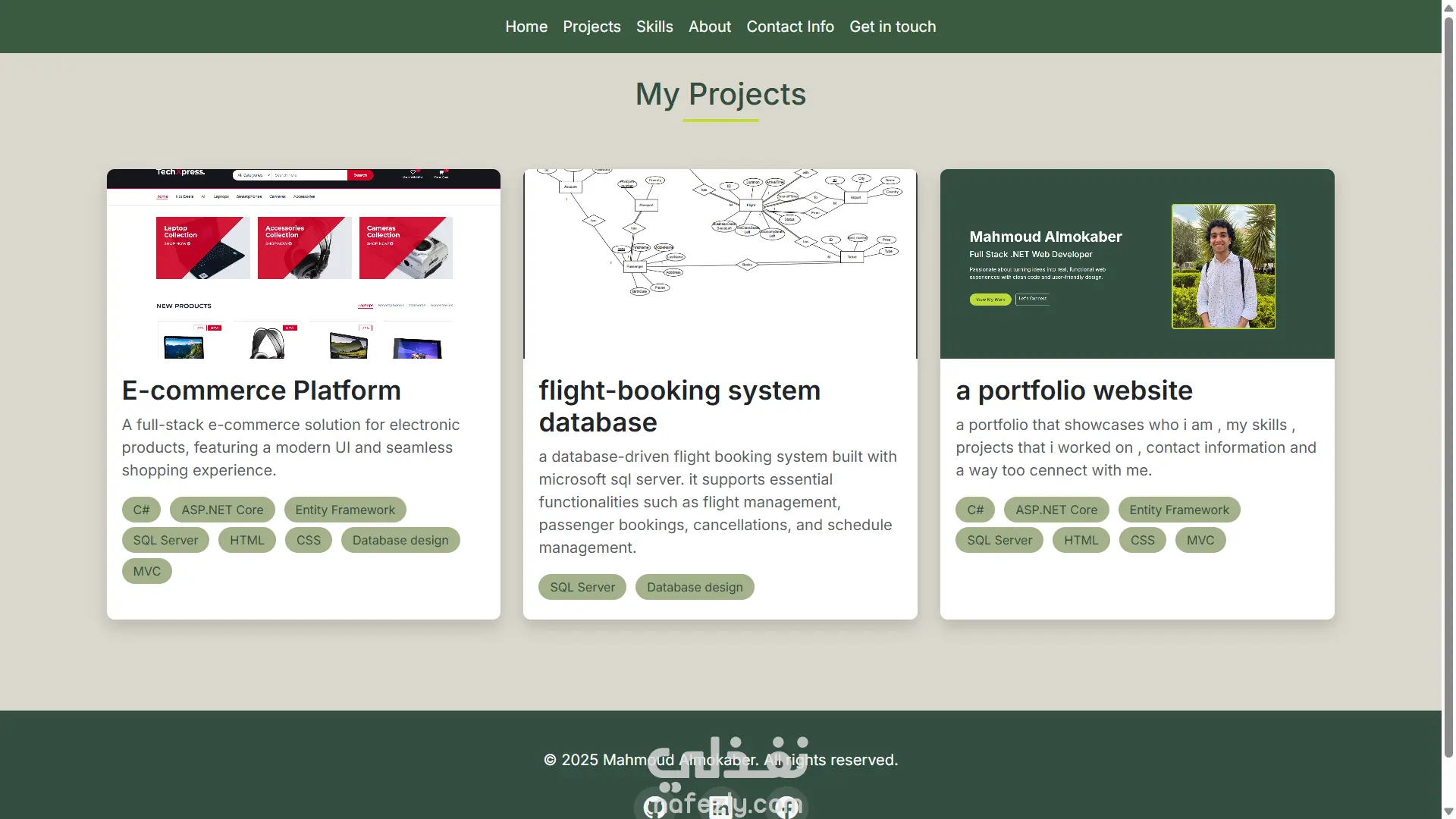 يعرض هذا البورتفوليو مهاراتي ومشاريعي في تصميم منظم وبسيط. يتضمن أقسامًا لخبرتي التقنية وأبرز أعمالي، مع وصف وروابط مرفقة. كما يحتوي على نموذج تواصل يتيح للزوار إرسال الرسائل بسهولة، مما يجعل التواصل من أجل فرص العمل أو التعاون أمرًا بسيطًا وسلسًا.