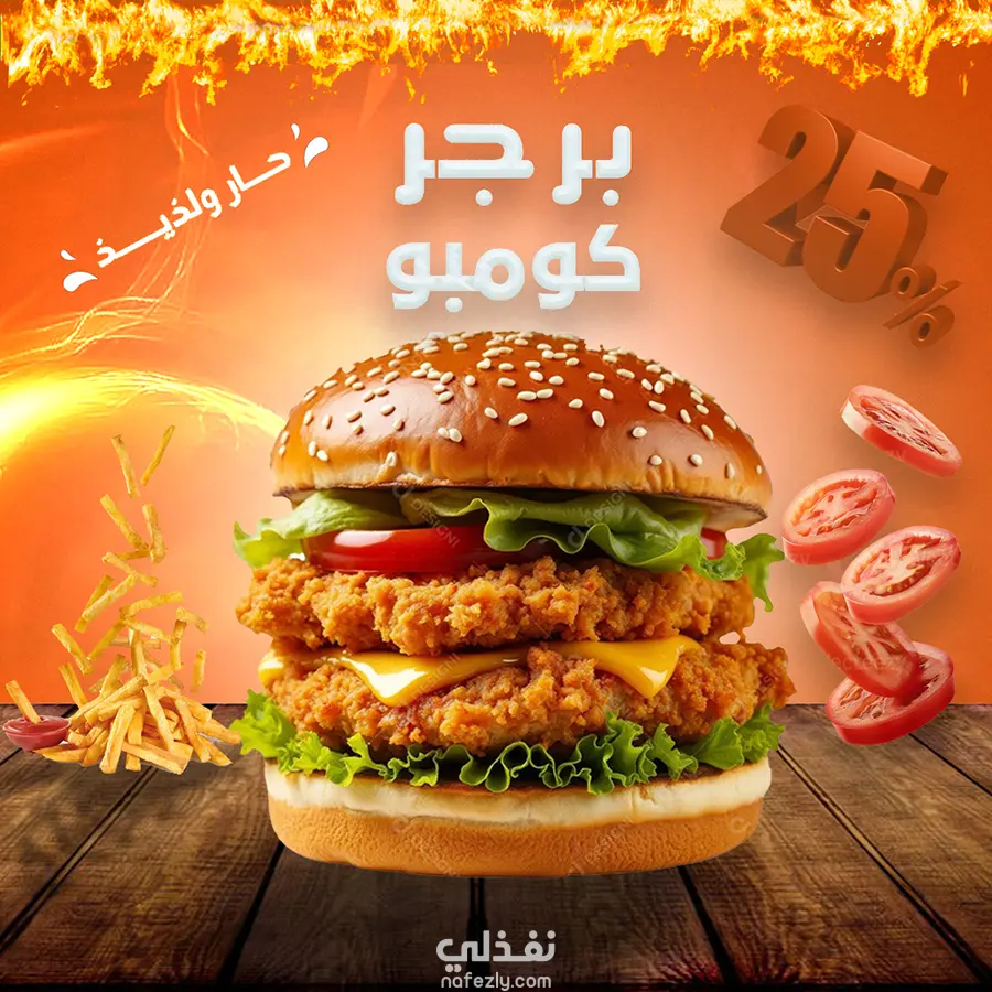 تصميم دعائي لعرض برجر كومبو بتخفيض 25%، بأسلوب بصري جذاب يناسب السوشيال ميديا والمطاعم. يعتمد التصميم على دمج صور الطعام بدقة عالية مع خلفية ديناميكية حارة تعكس نكهة المنتج، بالإضافة إلى إضافة عناصر بصرية مثل الطماطم والبطاطس المقلية والنيران لزيادة التأثير الإعلاني. التصميم مناسب لـ: الحملات الترويجية الإعلانات الممولة على فيسبوك وإنستجرام قوائم الطعام الرقمية السوشيال ميديا الخاصة بالمطاعم والفاست فود