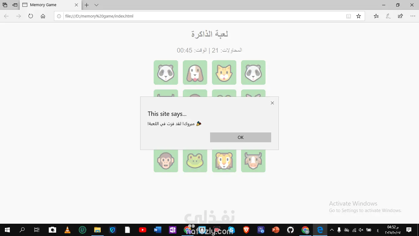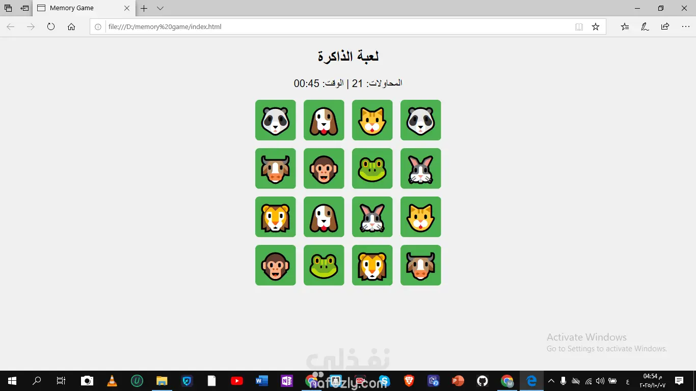 قمت بتصميم وبرمجة لعبة ذاكرة تعمل على المتصفح بواجهة تفاعلية ورسوم متحركة متجاوبة مع جميع الأجهزة.