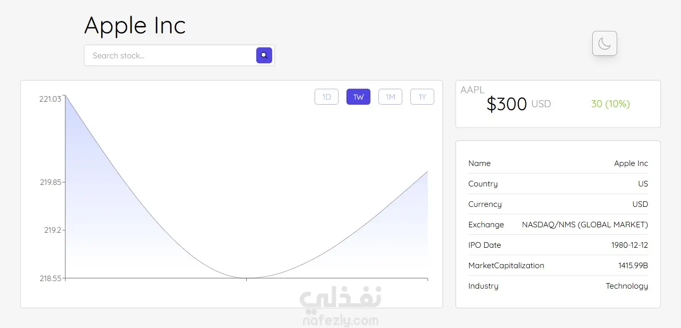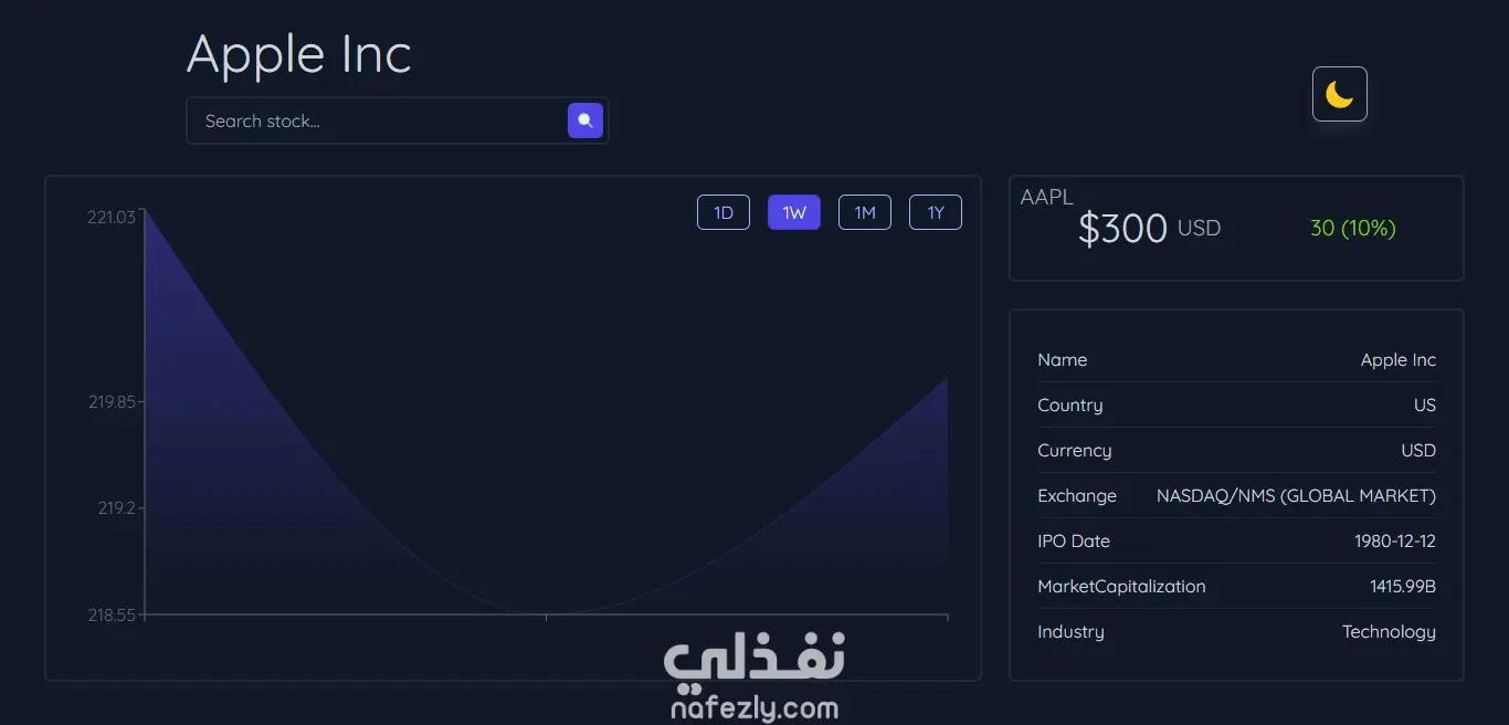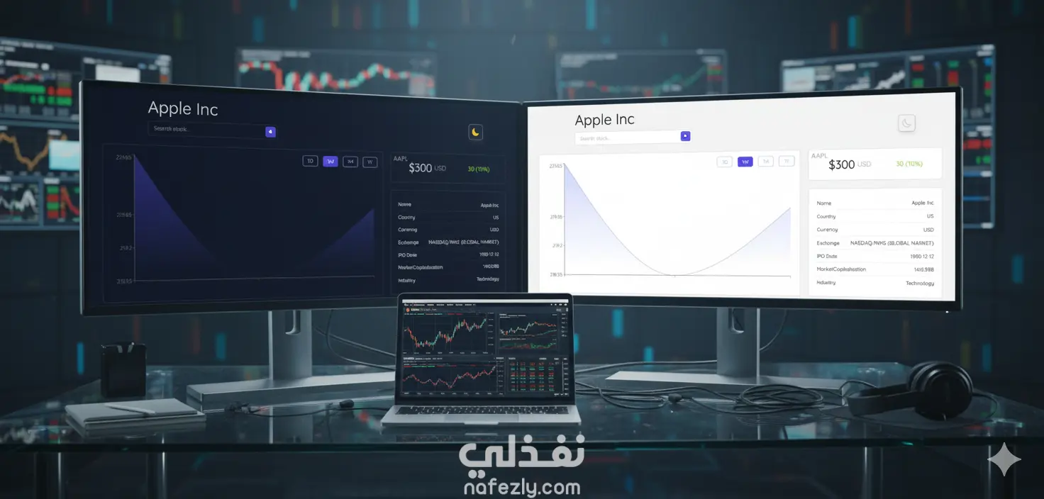 لوحة تحكم أسهم متقدمة بـ React | تتبع الأسهم المالية، رسوم بيانية، ووضع ليلي/نهاري