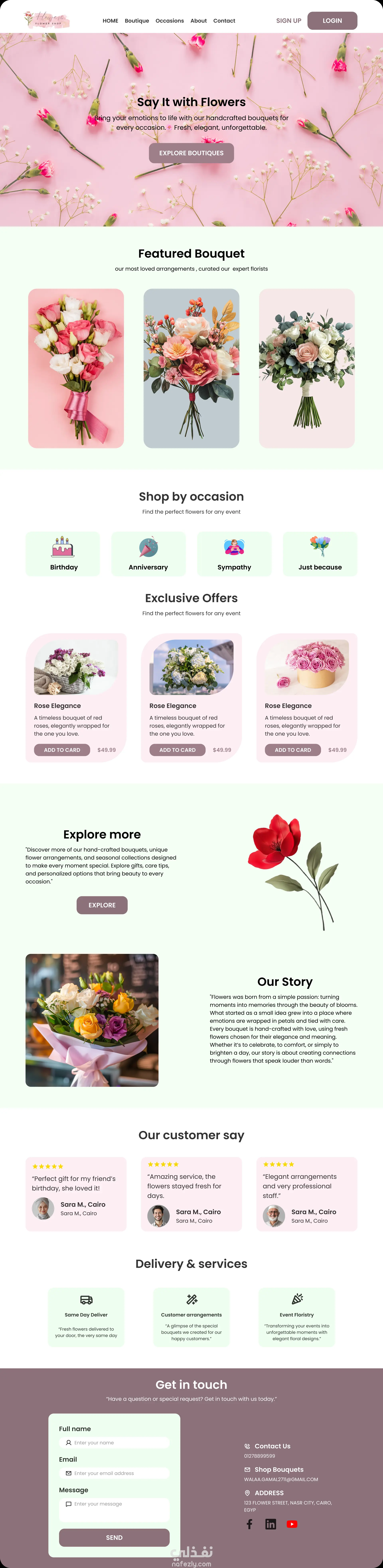Flowers هي صفحة هبوط (Landing Page) قمت بتصميمها لمحل مختص ببيع البوكيهات والزهور أونلاين. صُممت الصفحة لتمنح المستخدم تجربة مريحة وجذابة، تُبرز جمال الزهور وتدفع الزوار لاستكشاف المنتجات والشراء بسهولة. 🎯 أهداف التصميم جذب العملاء بتصميم أنيق وبسيط. عرض البوكيهات المميزة والعروض الحصرية بطريقة منظمة. بناء ثقة الزوار من خلال قسم آراء العملاء والمكونات الطبيعية. تسهيل التواصل مع المتجر والطلب مباشرة من الصفحة. 🎨 أسلوب التصميم اعتمدت في التصميم على ألوان هادئة وتوزيع متوازن للعناصر مع لمسة أنثوية ناعمة تعكس هوية العلامة التجارية. تم التصميم باستخدام Adobe XD بأسلوب عصري يراعي تجربة المستخدم وسهولة التصفح. 📋 أقسام الصفحة القسم الرئيسي (Hero Section) البوكيهات المميزة (Featured Bouquets) من نحن (About Us) العروض الحصرية (Exclusive Offers) آراء العملاء (Customer Reviews) المكونات الطبيعية (Our Materials) تواصل معنا (Contact Us) التذييل (Footer)