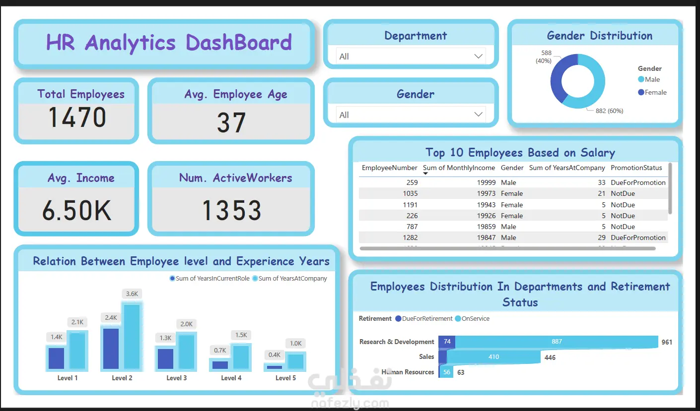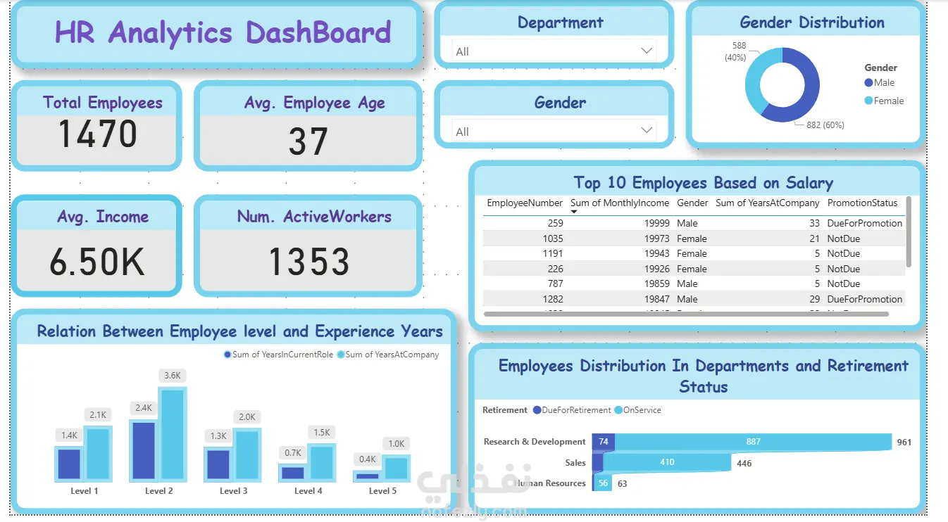 لوحة العرض ديناميكية وتفاعلية بالكامل، حيث يمكن للمستخدم فلترة البيانات بسهولة بناءً على القسم (Department) أو الجنس (Gender) للحصول على رؤى مخصصة وعميقة بشكل فوري.