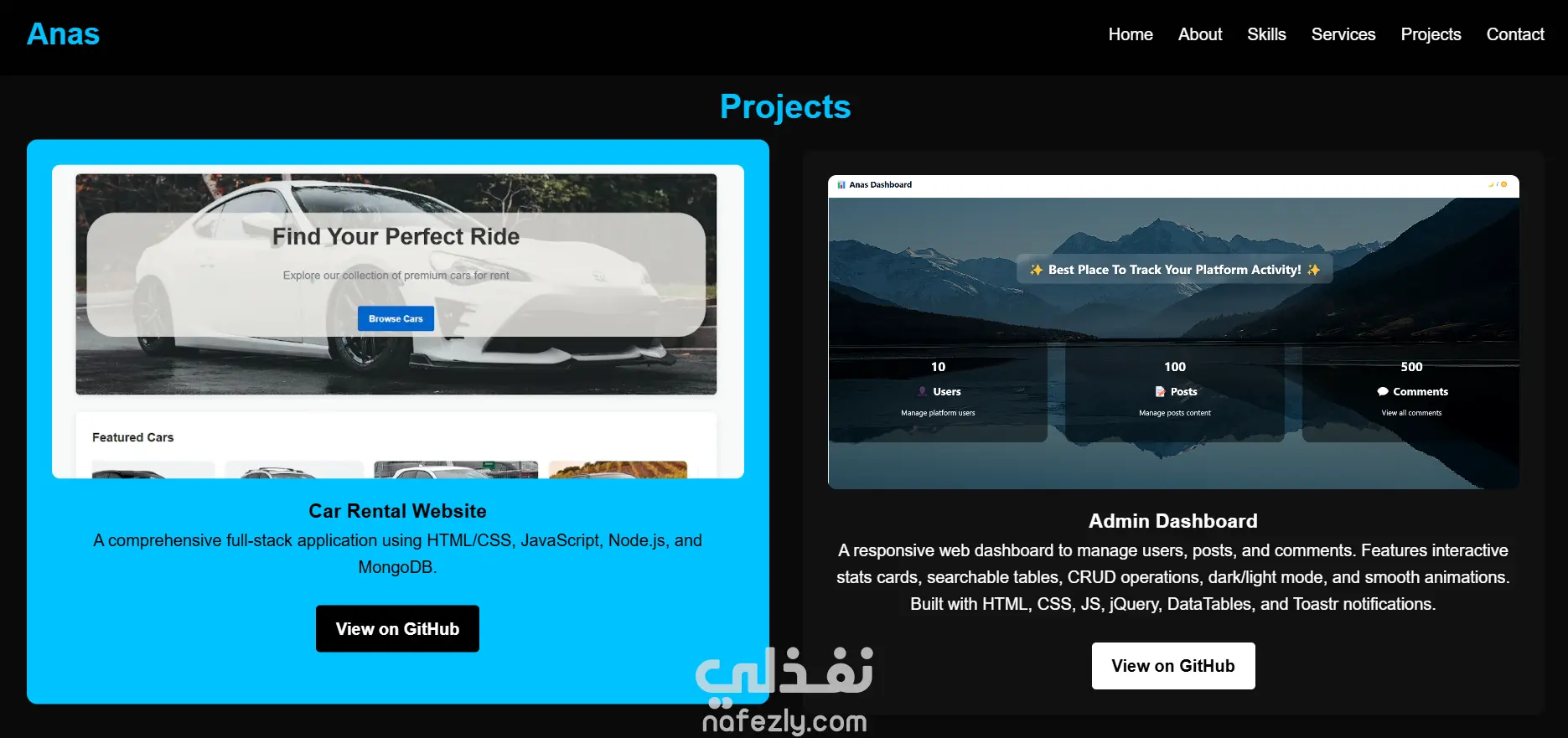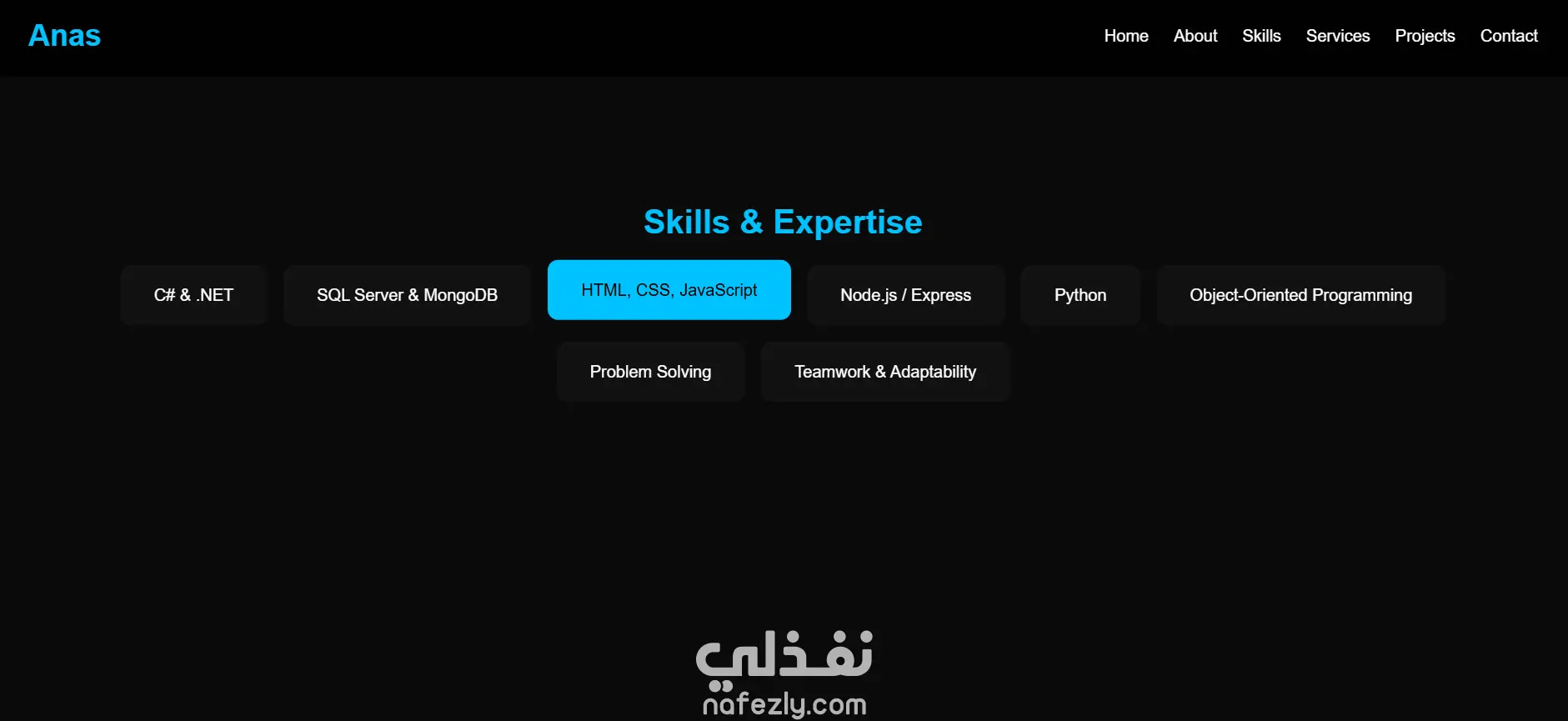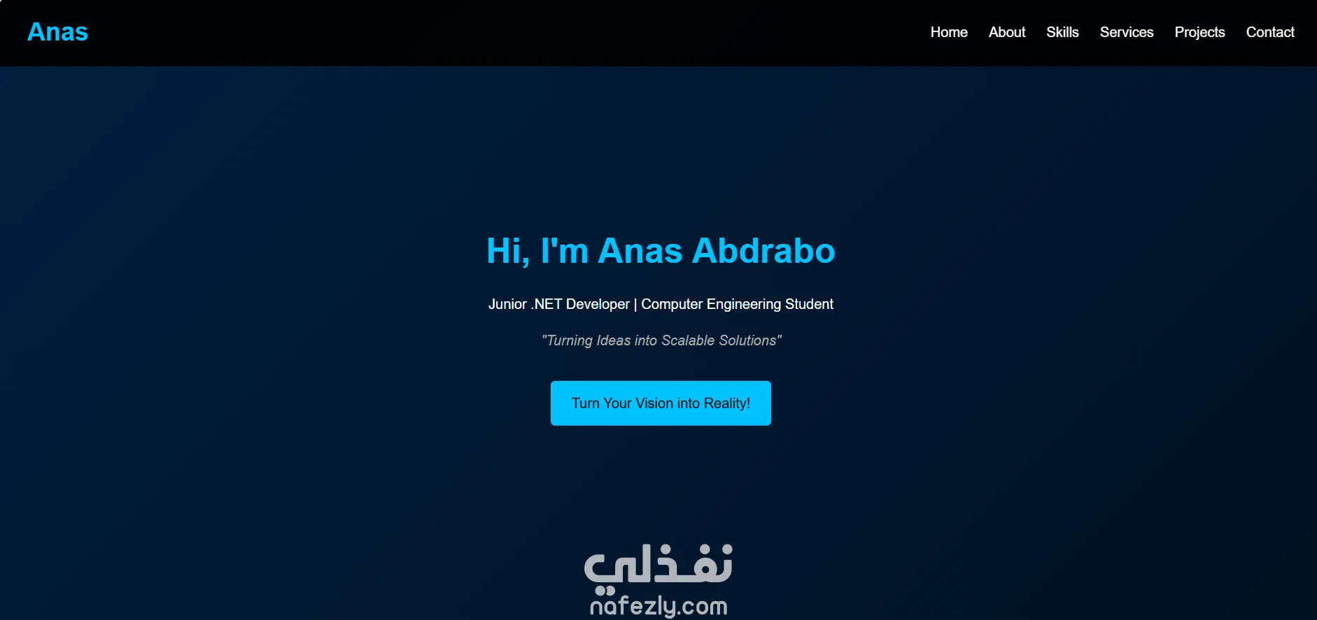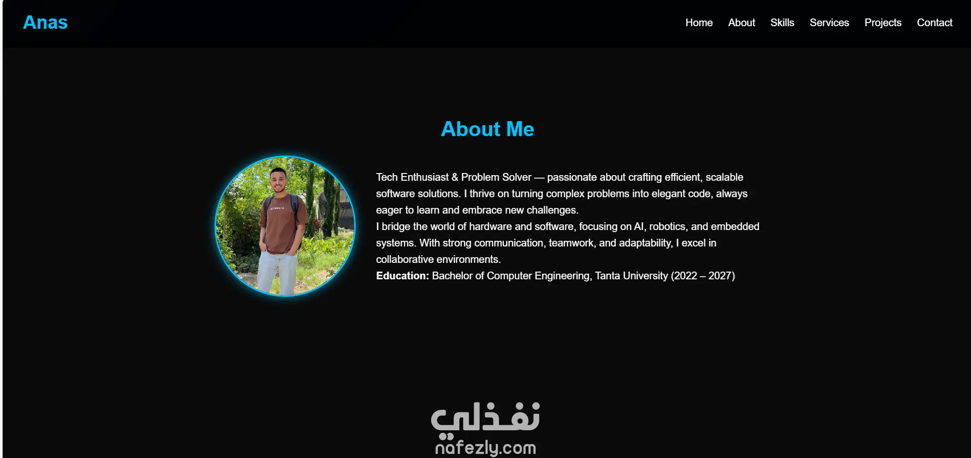 هذا المشروع هو موقعي الشخصي (بورتفوليو) الذي يعرض مهاراتي وأعمالي في تطوير واجهات المستخدم.