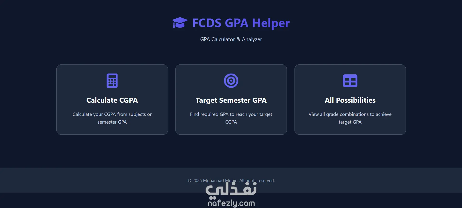 إنشاء أداة ويب تفاعلية لحساب المعدل التراكمي (CGPA) وتحليل النتائج الأكاديمية، مع القدرة على تحديد المعدل اللازم في الفصل القادم لتحقيق هدف معين، وعرض جميع تركيبات الدرجات الممكنة لتحقيق ذلك.