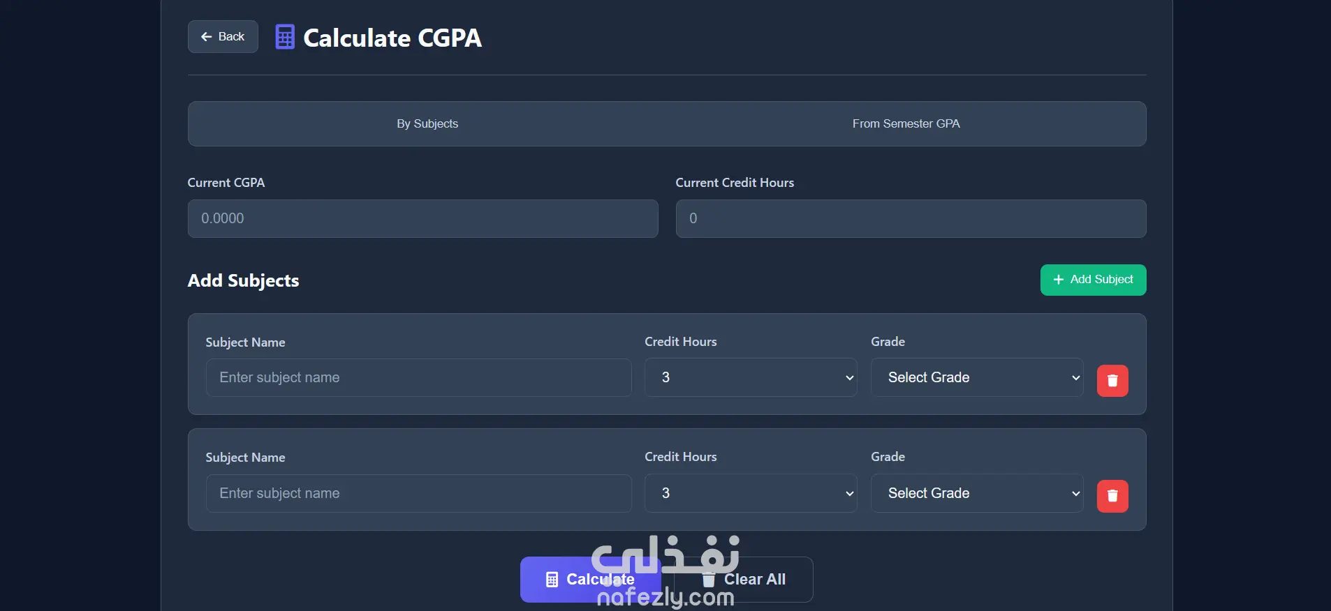 - إدخال بيانات الساعات المعتمدة والدرجات لكل مادة.