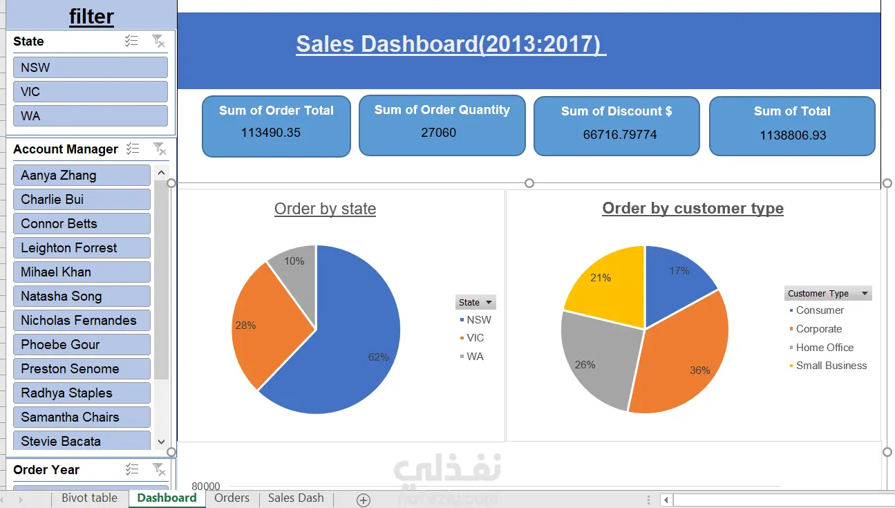 “تم إعداد لوحة تحكم تفاعلية باستخدام Microsoft Excel لعرض وتحليل بيانات المبيعات خلال الفترة (2013–2017). تتضمن اللوحة: • ملخص إجمالي الطلبات، الكميات، الخصومات، والإجمالي الكلي. • تحليل المبيعات حسب الولاية باستخدام مخطط دائري. • تحليل المبيعات حسب نوع العميل (مستهلك، شركات، مكاتب، أعمال صغيرة). • مقارنة أداء مديري الحسابات عبر السنوات باستخدام المخططات العمودية كما تحتوي على فلاتر تفاعلية (Slicers) تمكّن المستخدم من تصفية البيانات حسب السنة، الولاية، ومدير الحساب.”