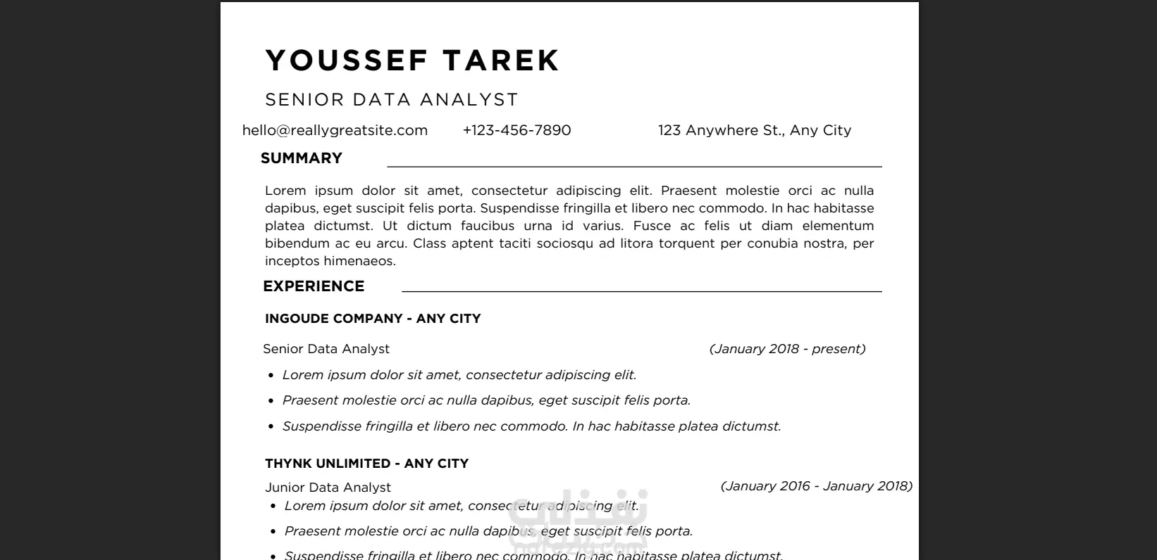 وصف الخدمة اجعل سيرتك الذاتية مميزة وتلفت الأنظار! هل تبحث/ين عن فرصة عمل أفضل؟ ابدأ بسيرة ذاتية قوية! من خلال خدمتي ستحصل/ين على CV احترافي صديق لأنظمة ATS يساعدك على الوصول إلى قائمة المرشحين الأوائل مميزات الخدمة لماذا تختار خدمتي لتصميم السيرة الذاتية؟ جودة عالية وتنسيق عصري. أسعار مناسبة للجميع. تسليم سريع ودعم للتعديلات. اختيار لغة السيرة (عربية أو إنجليزية) في صفحة واحدة فقط.