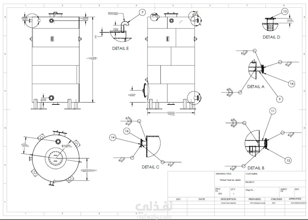 قمت بتصميم خزان تخزين رأسي بسعة 25 متر مكعب وفقًا لمواصفة API 650. شمل العمل نمذجة ثلاثية الأبعاد (3D)، ورسومات تصنيع تفصيلية ثنائية الأبعاد (2D)، بالإضافة إلى الحسابات الميكانيكية اللازمة لتحديد سماكة الجدار، وتقوية الفتحات (الفلنجات)، وتصميم هيكل السقف، وتفاصيل نظام الدعم. تم تسليم مجموعة كاملة من الرسومات الجاهزة للتصنيع، شاملة المقاطع والتفاصيل الدقيقة، لضمان الدقة والسلامة وسهولة التنفيذ. نُفذ المشروع باستخدام برنامج SolidWorks بما يتماشى مع متطلبات العميل والمعايير الصناعية المعتمدة.