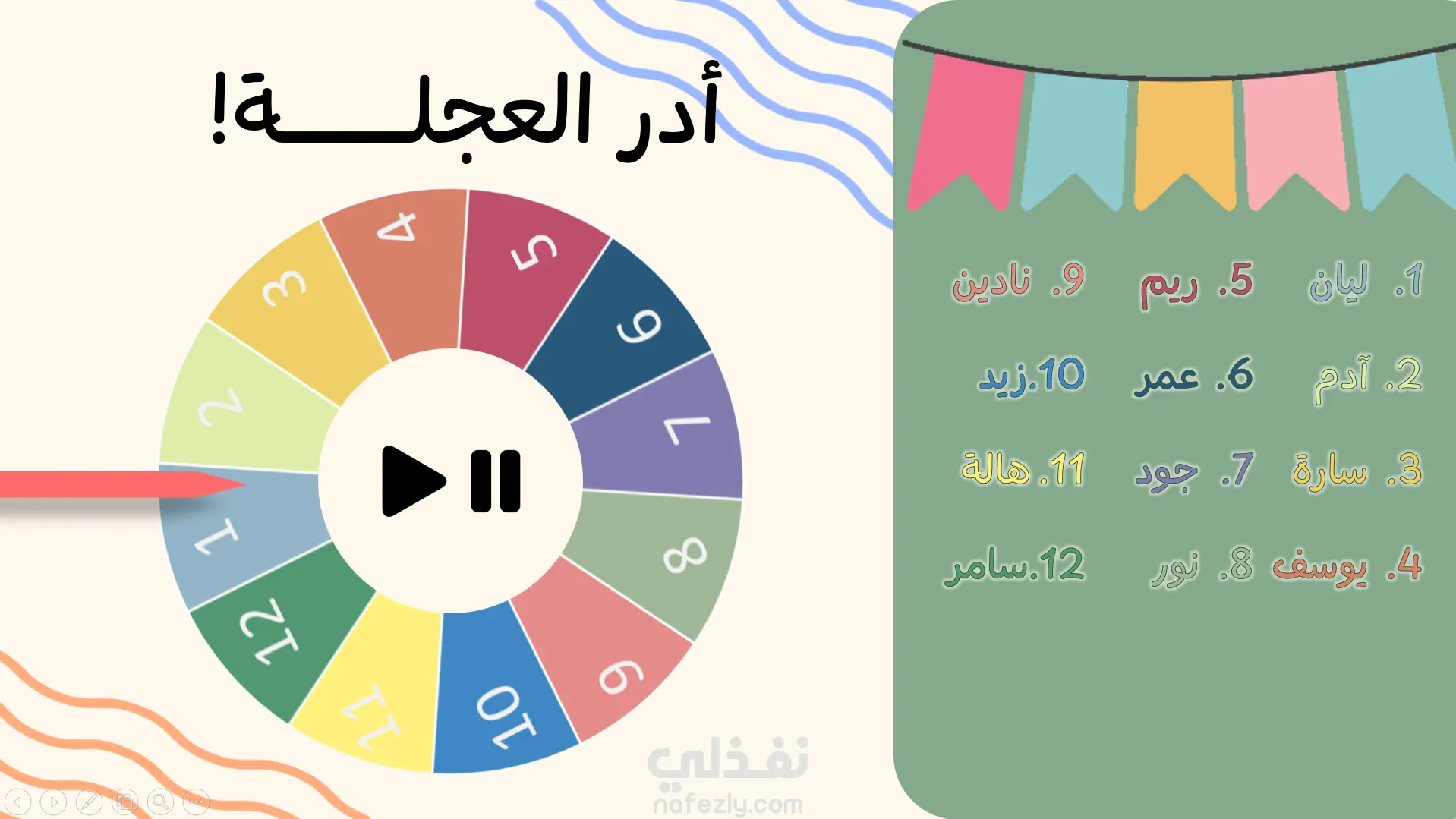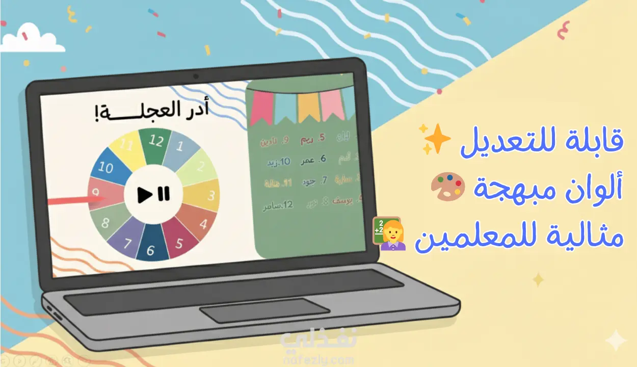 العجلة تدور عند الضغط وتعرض أسماء الطلاب أو المفاجآت أو الأسئلة بطريقة ممتعة تشجع الأطفال على المشاركة والتفاعل.