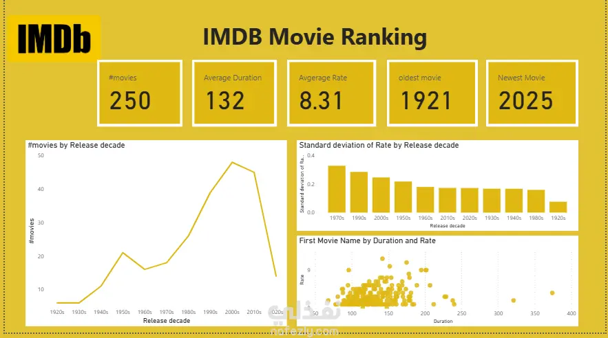 في مشروع تحليل بيانات موقع IMDb، ركزت على دراسة قائمة أفضل 250 فيلم لفهم أنماط صناعة السينما عبر العقود، والعوامل اللي ممكن تأثر على تصنيف الفيلم ومكانته بين الجمهور والنقّاد.