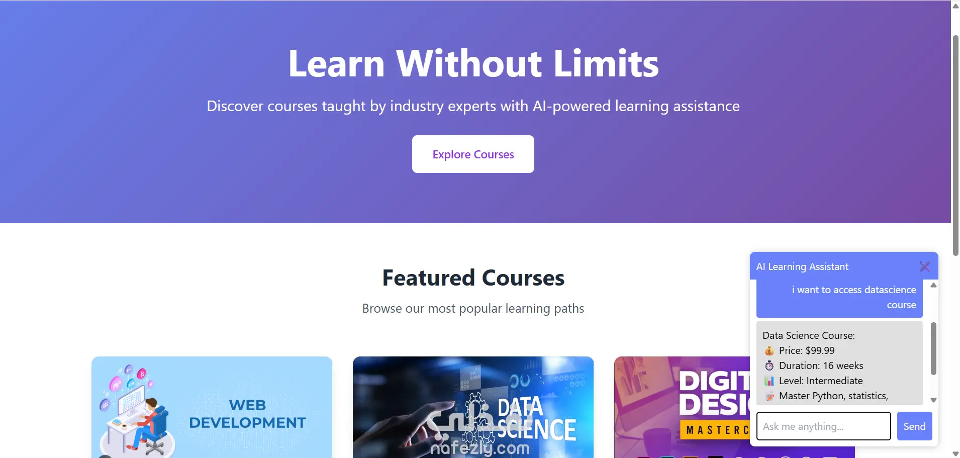 استخدمت في التصميم HTML وCSS وJavaScript مع واجهة دردشة ذكية (chatbot)لمساعدة المستخدم في اختيار الكورس المناسب.