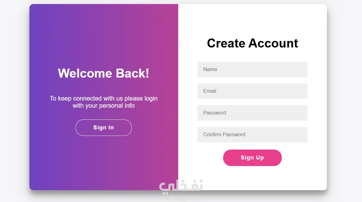 تتضمن الصفحة نماذج إدخال أنيقة، وأزرار تفاعلية، وتأثيرات حركية بسيطة عند التبديل بين الدخول والتسجيل.