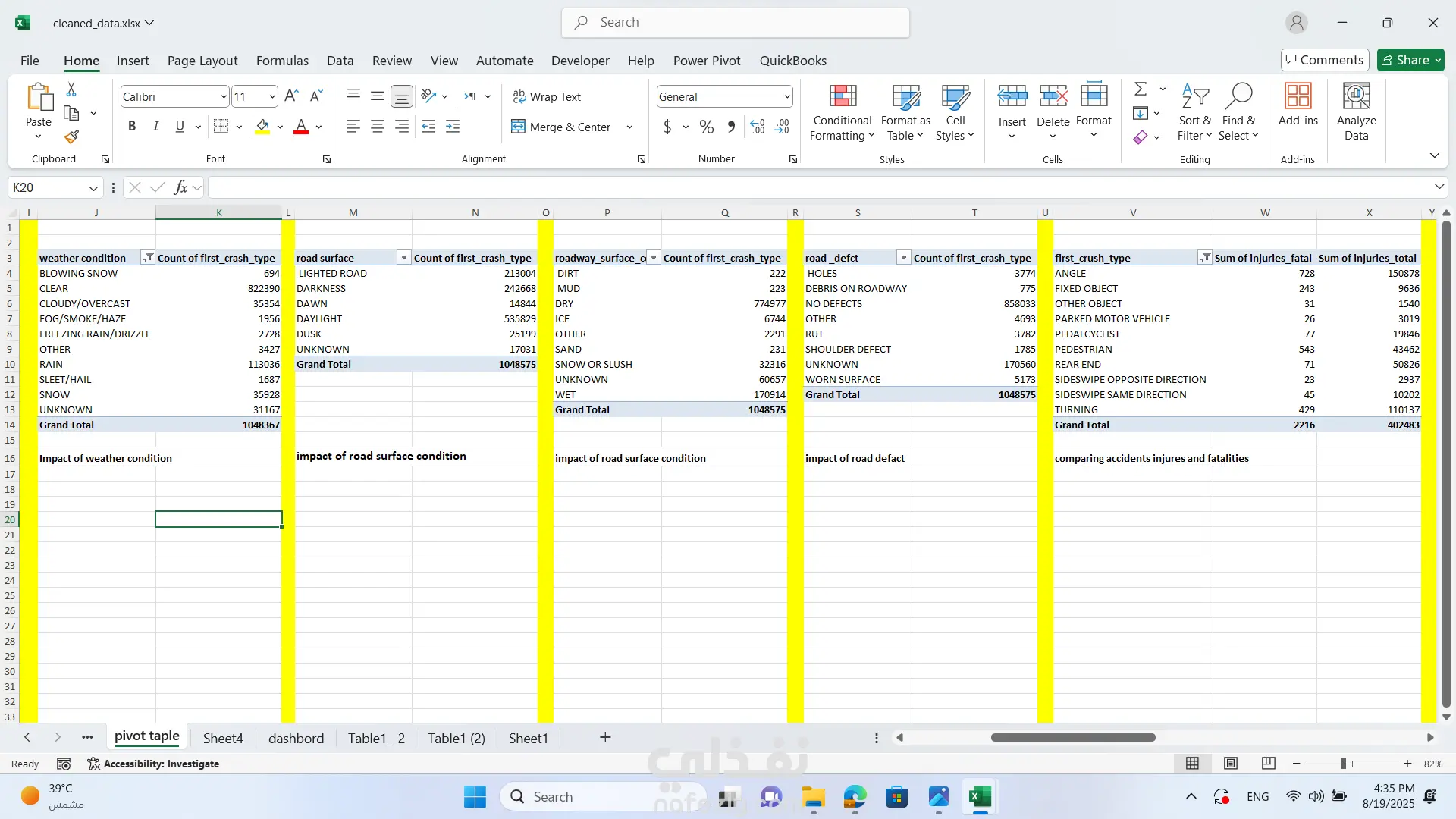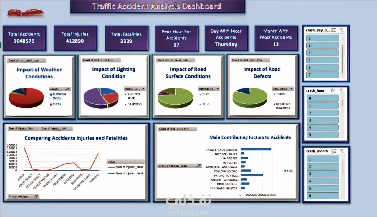 المشكلة: كانت بيانات حوادث المرور ضخمة وغير منظمة، مما جعل من الصعب فهم الأسباب الحقيقية وراء الحوادث واتخاذ قرارات فعّالة للحد منها. الحل: قمتُ بتنظيف البيانات ومعالجتها لضمان دقة التحليل، ثم صمّمت Dashboard تفاعلية باستخدام Excel تعرض أهم المؤشرات مثل عدد الحوادث، الإصابات، الوفيات، الأوقات الحرجة، والعوامل المؤثرة. كما أعددت تقريرًا تحليليًا شاملاً يتضمّن توصيات عملية للتحسين. النتائج: -عرض مؤشرات دقيقة وسهلة التفسير لدعم متخذي القرار. -تحديد الأسباب والعوامل الأكثر تأثيرًا في الحوادث. -تقديم توصيات عملية مثل تحسين الإضاءة، معالجة عيوب الطرق، وزيادة الرقابة في الأوقات الحرجة. القيمة المضافة: حوّلت البيانات غير المنظمة إلى لوحة معلومات ذكية وتقرير تحليلي يدعمان صناع القرار في وضع خطط واقعية لتقليل نسب الحوادث. الأدوات: Excel (Data Cleaning – Analysis – Dashboard – Visualization – Slicers) المهارات: Data Cleaning | Data Analysis | Dashboard Design | Storytelling | Reporting & Recommendations