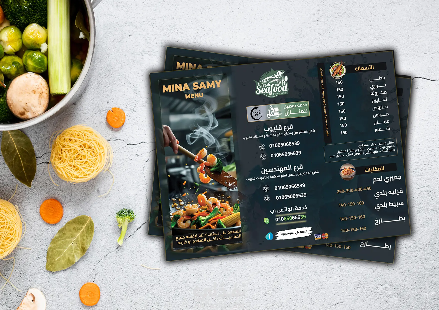 تصميم منيو ثلاثي الطي لمطعم مأكولات بحرية
