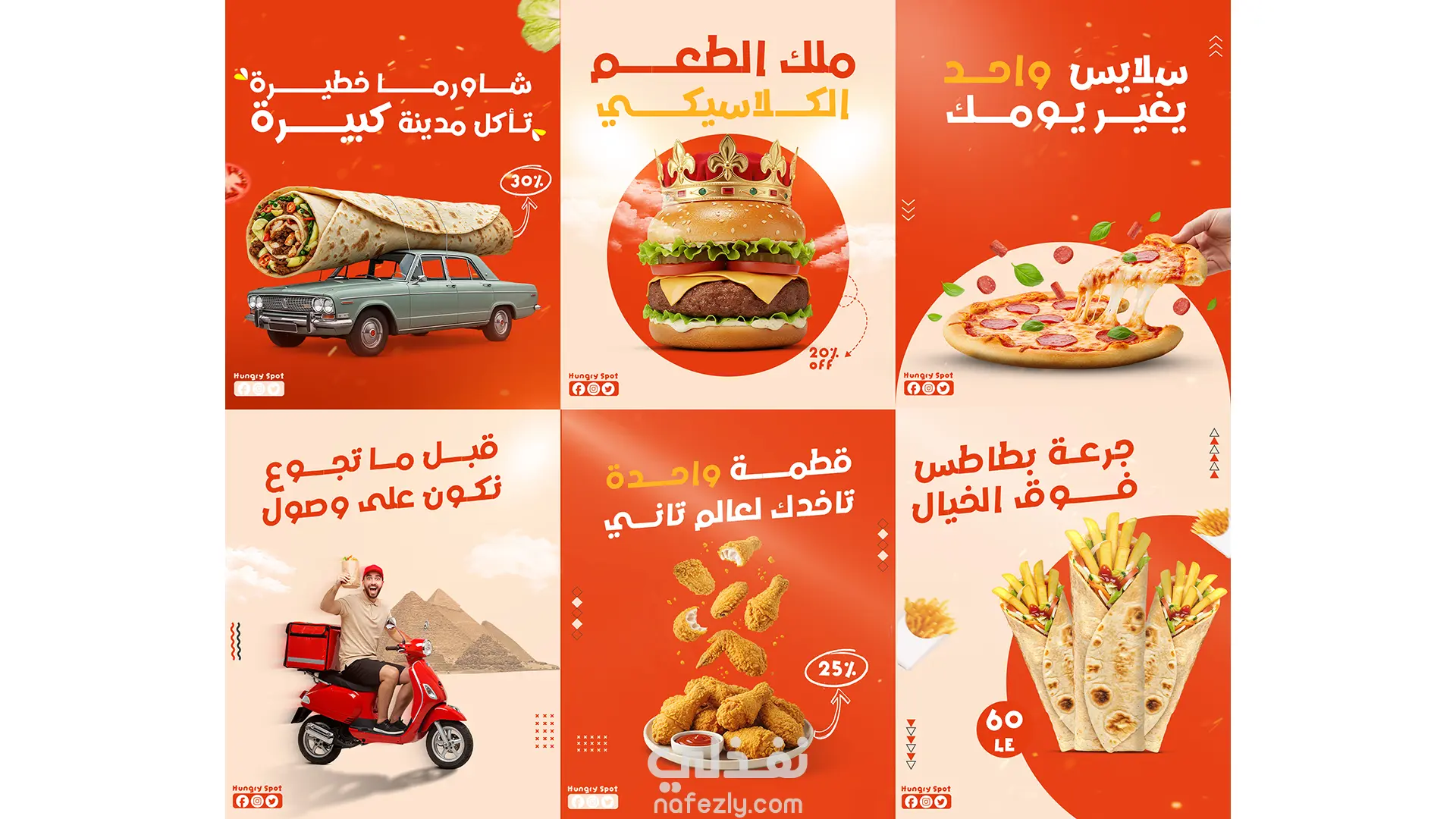 -تصميم حملة إعلانات سوشيال ميديا لمطعم Hungry Spot، تم التركيز فيها على إبراز المنتجات بطريقة مبتكرة وجذابة، مع استخدام أسلوب مرح وشهي يجذب العملاء. -ما يميز التصميم: ألوان مبهجة تعكس أجواء الطعام والشهية. توظيف عناصر مبتكرة لشد الانتباه وزيادة الطابع المرح. إبراز العروض والخصومات بشكل واضح تصميمات متناسقة تدمج النصوص مع الصور بشكل سلس وجذاب. هوية بصرية متكاملة للمطعم قابلة للاستخدام في الحملات التسويقية على مختلف المنصات. -النتيجة: حملة إعلانية بصرية قوية تساعد المطعم على جذب العملاء، إبراز العروض المميزة، وتعزيز هوية البراند في سوق الأطعمة السريعة.