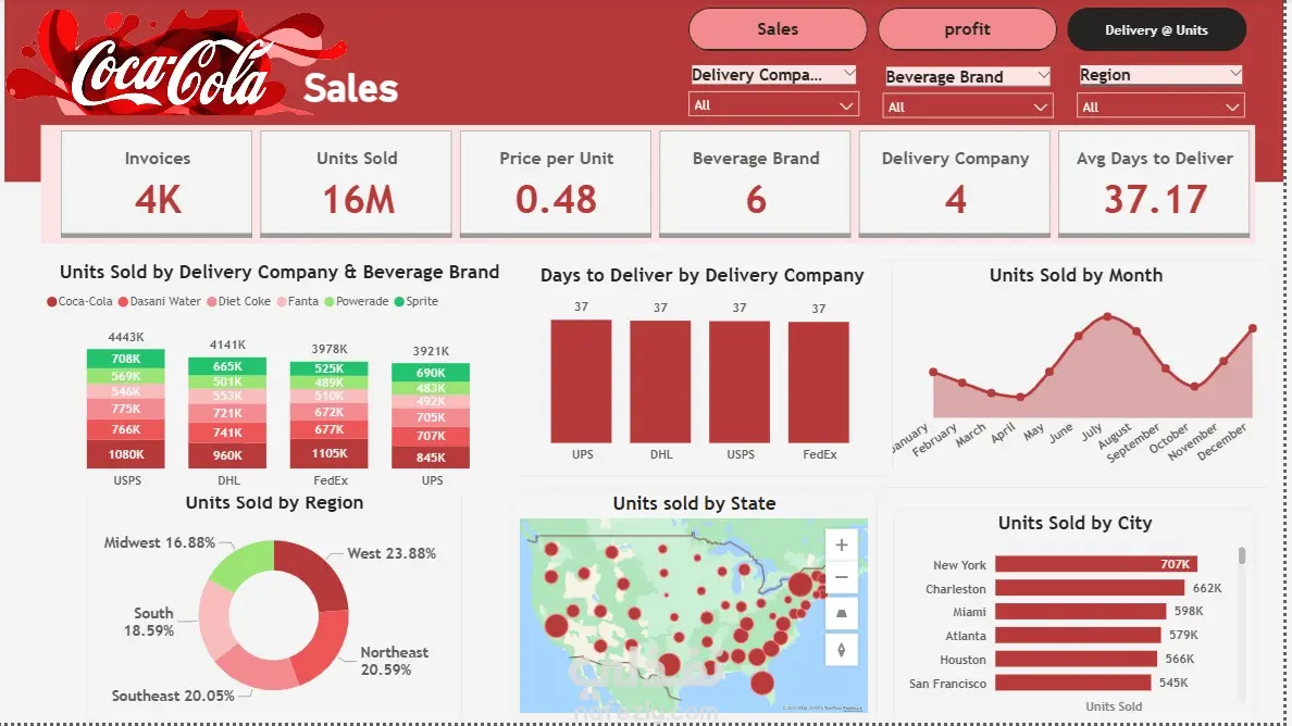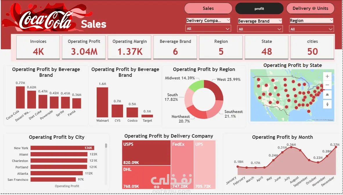 داشبورد لتحليل بيانات شركة كوكاكولا وتحديد حجم المبيعات والكميات المباعة و المنتجات والاماكن والفترات الزمنية الاكثر ربحا