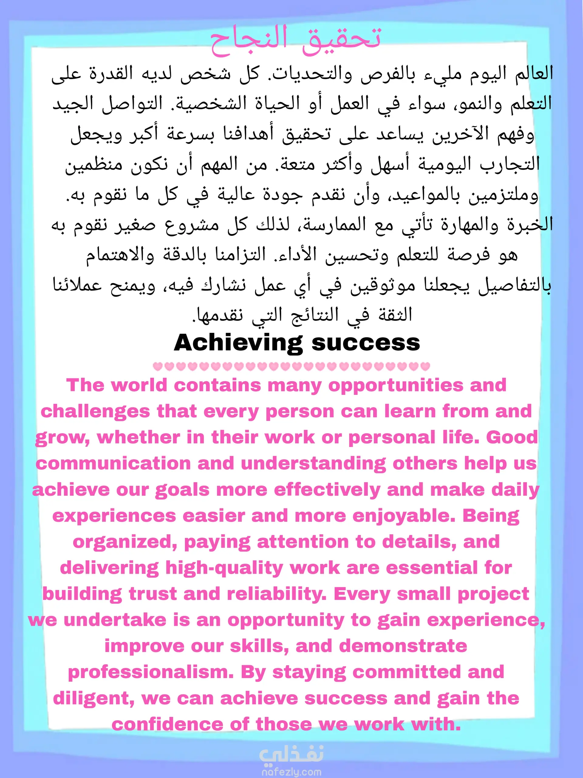 خدمة ترجمة من العربية إلى الإنجليزية بمستوى دقيق واحترافي. تشمل الخدمة ترجمة المقالات، القصص، المحتوى التعليمي، والمحتوى الثقافي بطريقة سلسة وطبيعية تحافظ على معنى وروح النص الأصلي. الترجمة لا تقتصر على الكلمات فقط، بل تهتم بنقل الأفكار والمشاعر بطريقة واضحة وسهلة القراءة لجميع القراء. يتم التركيز على الأسلوب والدقة في كل نص، مع مراعاة التفاصيل الصغيرة التي تجعل النص النهائي ممتعًا ومفهومًا. هذه الخدمة مناسبة للكتاب، المدونين، الناشرين، وأي شخص يحتاج إلى محتوى مترجم بشكل احترافي يساعد على إيصال الرسائل بشكل واضح وفعّال.