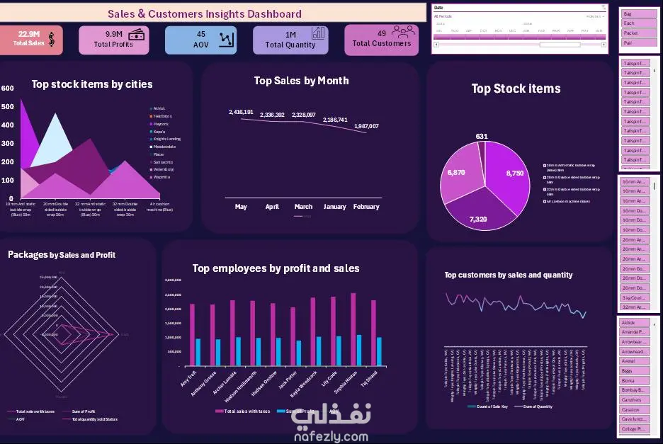 أداة مدمجة تعرض إجمالي المبيعات، الأرباح، متوسط قيمة الطلب، الكمية، وعدد العملاء، مع رسومات بيانية توضح المخزون، اتجاهات المبيعات، الباقات، الموظفين، والعملاء، لتوفير رؤى سريعة عن الأداء التجاري.