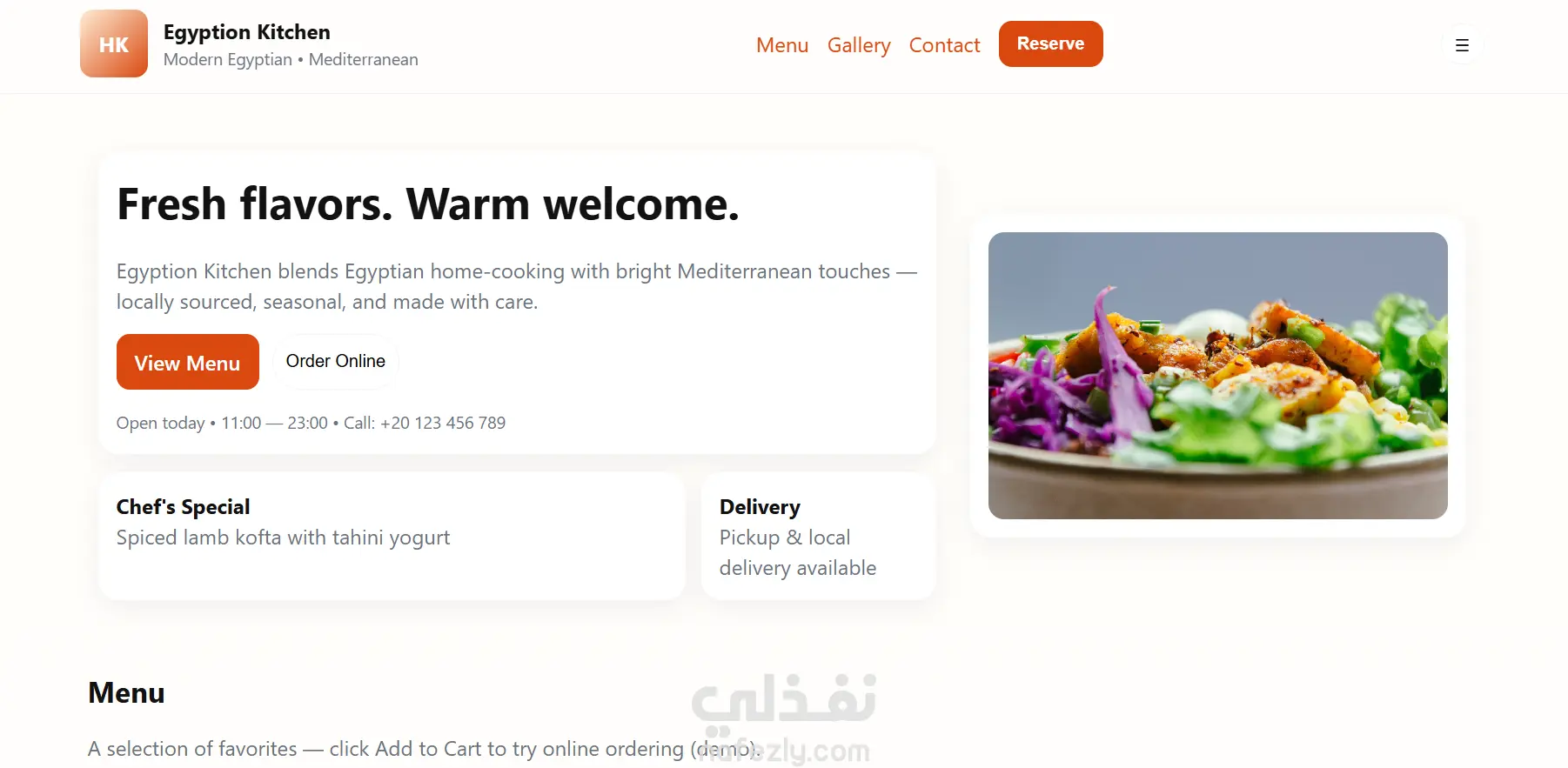 هو موقع إلكتروني لمطعم، أحادي الصفحة ومتجاوب بالكامل، تم بناؤه باستخدام HTML وCSS وJavaScript فقط (كلها مدمجة داخل ملف واحد لسهولة الاستخدام والنقل). يقدّم واجهة عصرية وأنيقة لمطعم يقدم المأكولات المتوسطية والمصرية، مع تركيز على سهولة الاستخدام، الوصولية، وسرعة التحميل — دون الاعتماد على أي أُطر عمل خارجية.