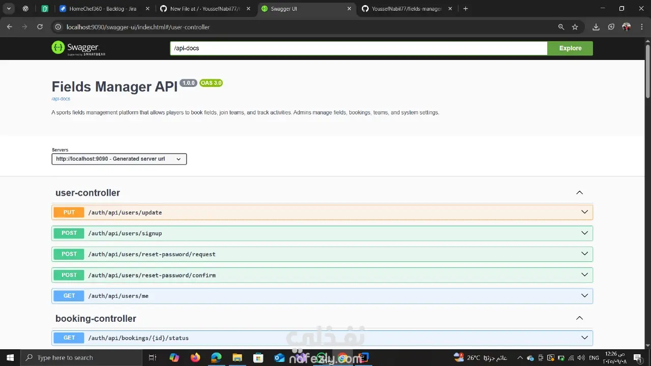 قمت بتطوير الجزء الخلفي (Backend) من نظام إدارة ملاعب متكامل باستخدام Spring Boot وMySQL، يتيح للمستخدمين حجز الملاعب وإدارة الجداول الزمنية بسهولة، مع صلاحيات مختلفة للمسؤولين والمستخدمين. المهام التي قمت بها: تصميم قاعدة البيانات وربطها بـ Spring Boot . إنشاء واجهات RESTful APIs لإدارة المستخدمين، الحجوزات، والملاعب. تطبيق التحقق من البيانات (Validation) ومعالجة الأخطاء. بناء بنية مشروع منظمة وفقًا لمبدأ MVC. اختبار جميع الـ APIs باستخدام Postman. التقنيات المستخدمة: Java – Spring Boot – MySQL – Maven – Postman.