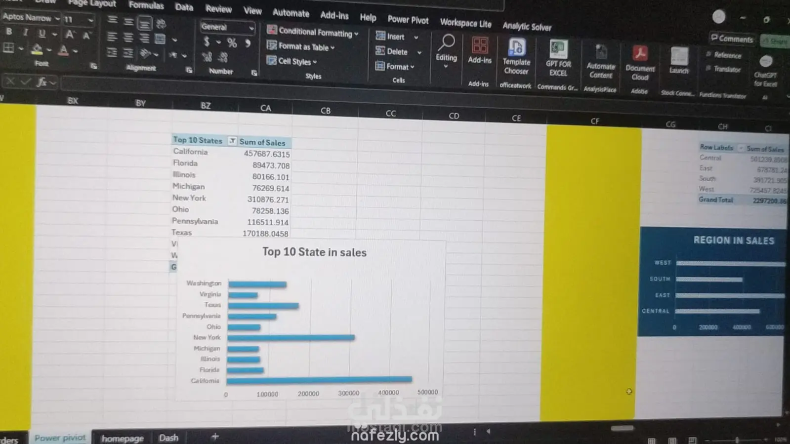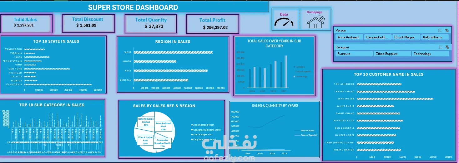 مشروع لتحليل بيانات المبيعات في Super Store باستخدام Excel (Power Query, Power Pivot). اللوحة التفاعلية بتعرض مؤشرات أساسية منها: إجمالي المبيعات: $2,297,201 إجمالي الخصومات: $1,561.09 إجمالي الكمية: 37,873 إجمالي الأرباح: $286,397.02 أفضل 10 ولايات في المبيعات أفضل 10 عملاء من حيث المبيعات توزيع المبيعات حسب الأقاليم والفروع الفرعية تطور المبيعات عبر السنوات (2014 – 2017) مبيعات وأرباح المندوبين حسب الأقاليم اللوحة بتساعد على تحويل بيانات المبيعات لرؤى بصرية واضحة تدعم اتخاذ قرارات استراتيجية وتحسين الأداء.