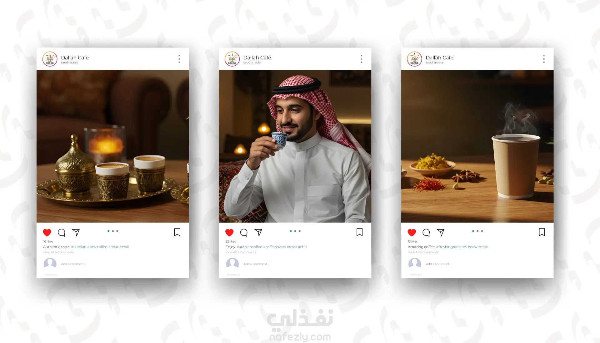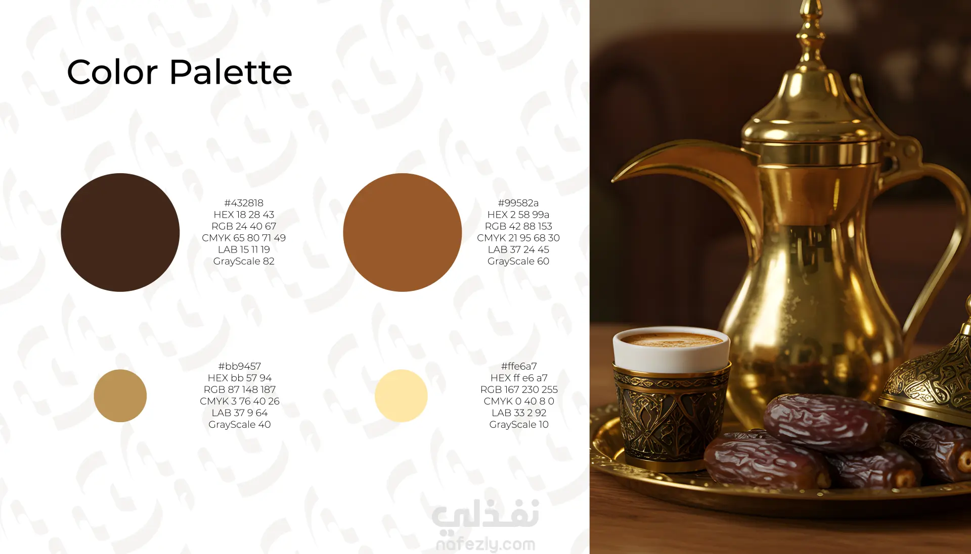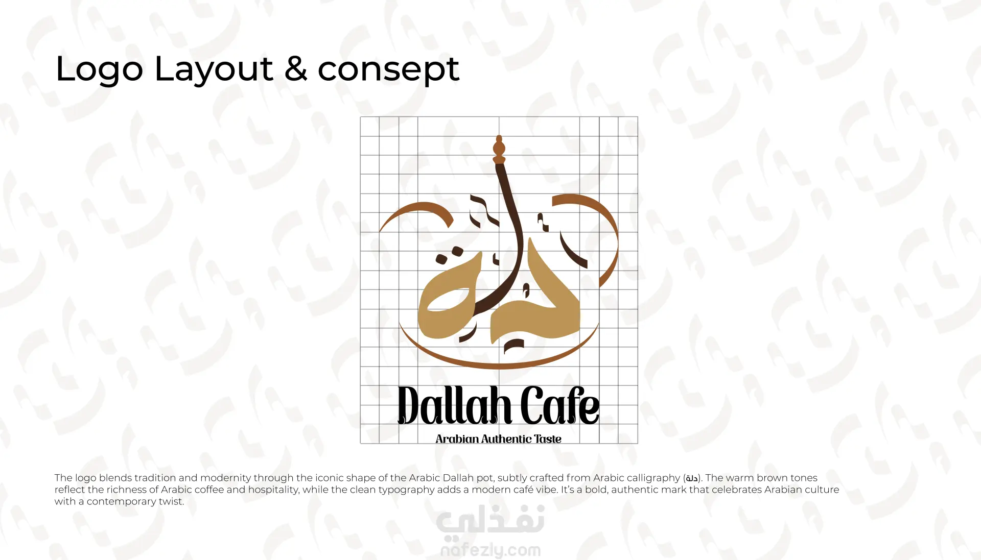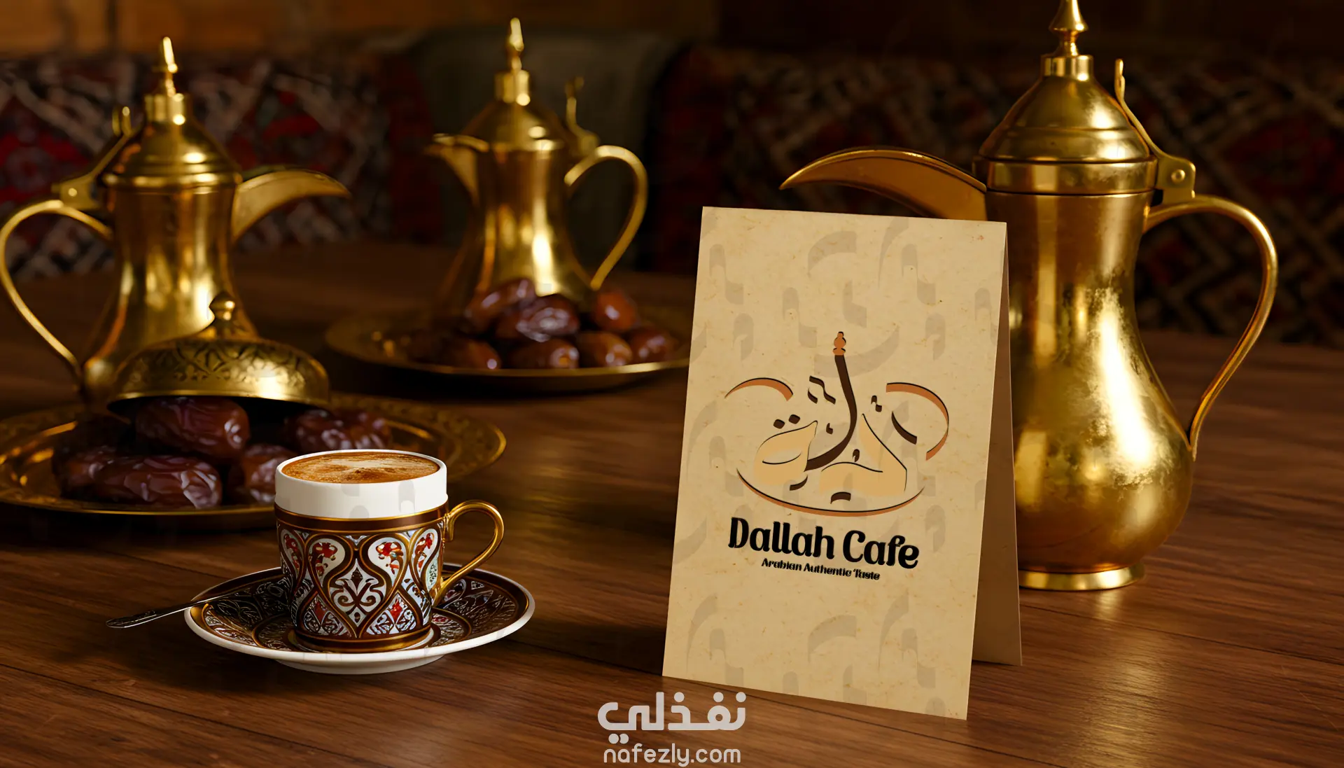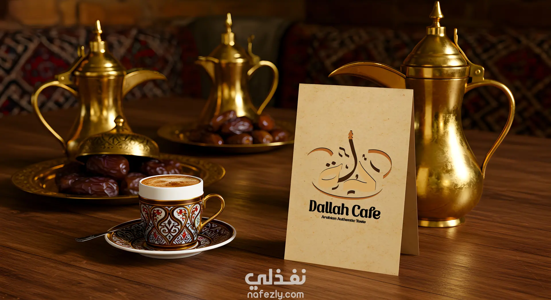 يجمع الشعار بين الأصالة والحداثة من خلال الشكل الأيقوني لـ دلة القهوة العربية، والمصاغة بأسلوب فني مستوحى من الخط العربي. تعكس درجات البني الدافئة ثراء القهوة العربية وكرم الضيافة، بينما تضيف الخطوط العصرية لمسة من روح المقاهي الحديثة. النتيجة شعار جريء وأصيل يجسد جوهر الثقافة العربية بلمسة معاصرة تجمع بين التراث والأناقة الحديثة.