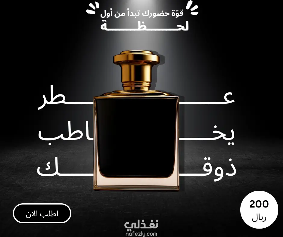 تصميم إعلان بصري لعطر فاخر يجمع بين الفخامة والبساطة. الفكرة بتعتمد على إبراز قوة الحضور والأناقة من أول لحظة باستخدام توازن مثالي بين الألوان الداكنة والإضاءة الهادئة اللي تركز على الزجاجة كعنصر أساسي في التصميم. استخدمت ألوان الأسود والذهبي للتعبير عن الرفاهية والرُقي، مع خط عربي أنيق يعكس الطابع الكلاسيكي للعطور الفاخرة. الهدف من التصميم هو إبراز المنتج بطريقة راقية تجذب الفئة المهتمة بالعطور الفخمة، مع الحفاظ على وضوح الرسالة التسويقية وعناصر الـCall to Action مثل (اطلب الآن) و(السعر).