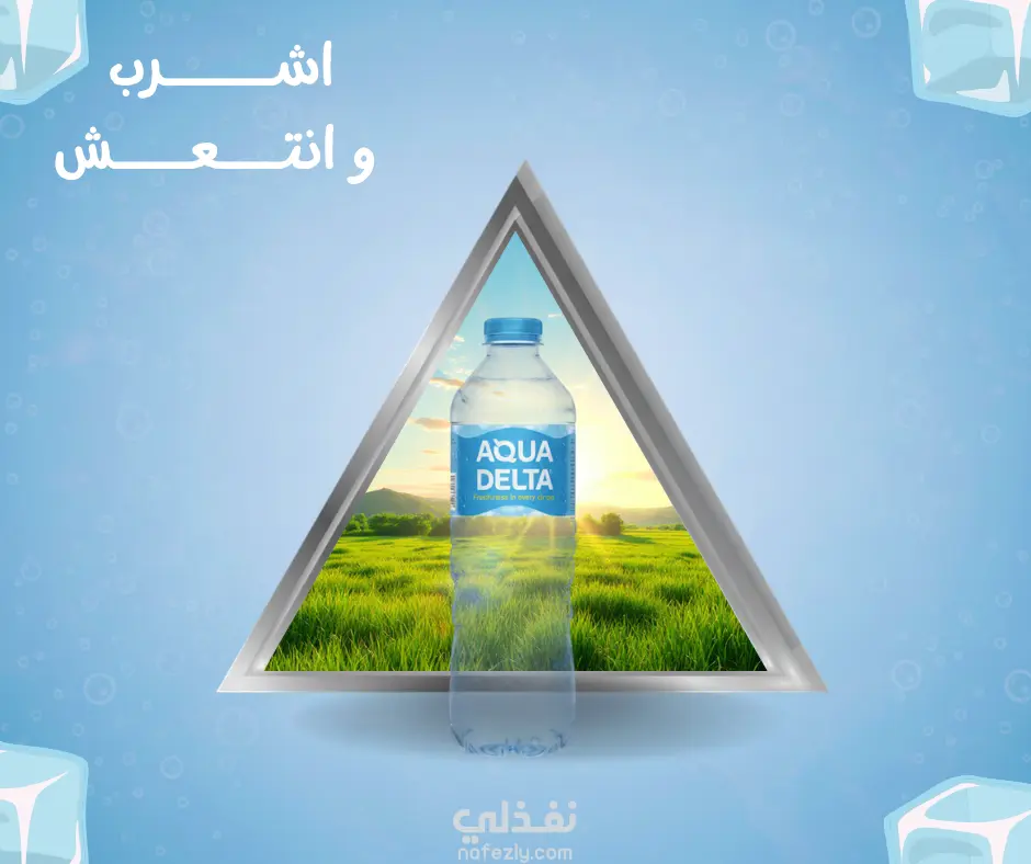 إعلان لمياه نقية، ركزت فيه على الألوان الهادية ودرجات الأزرق عشان يوصل فكرة النقاء والانتعاش. استخدمت شكل مثلث بسيط يدي إحساس بالصفاء.