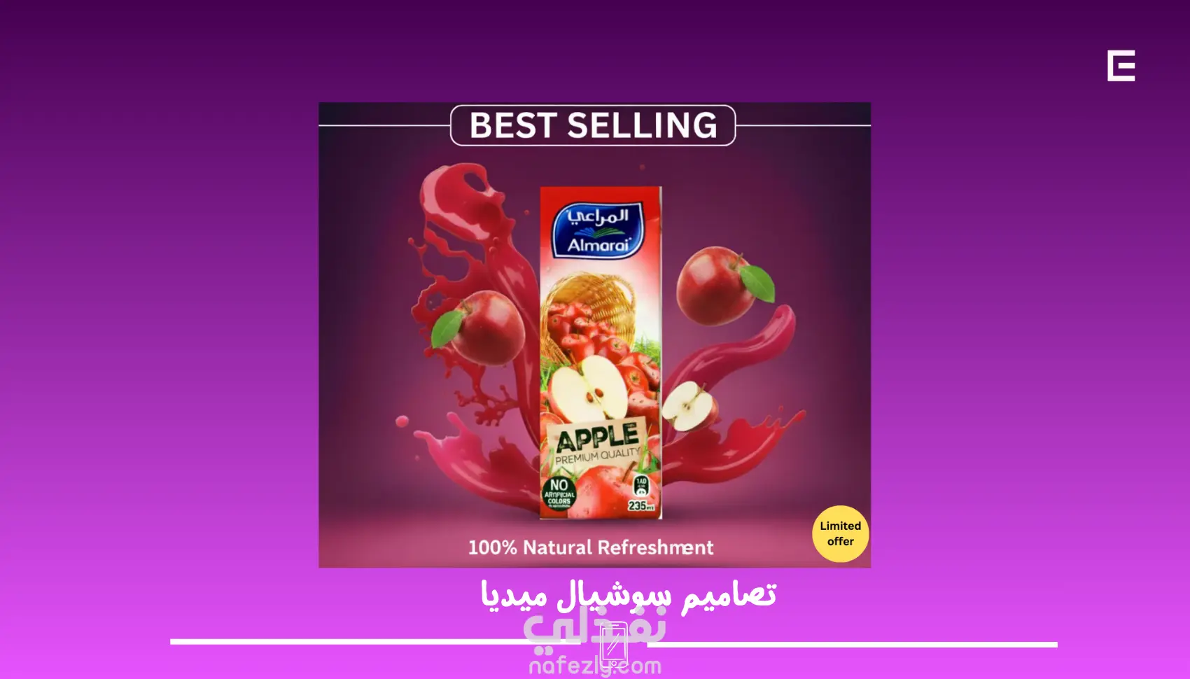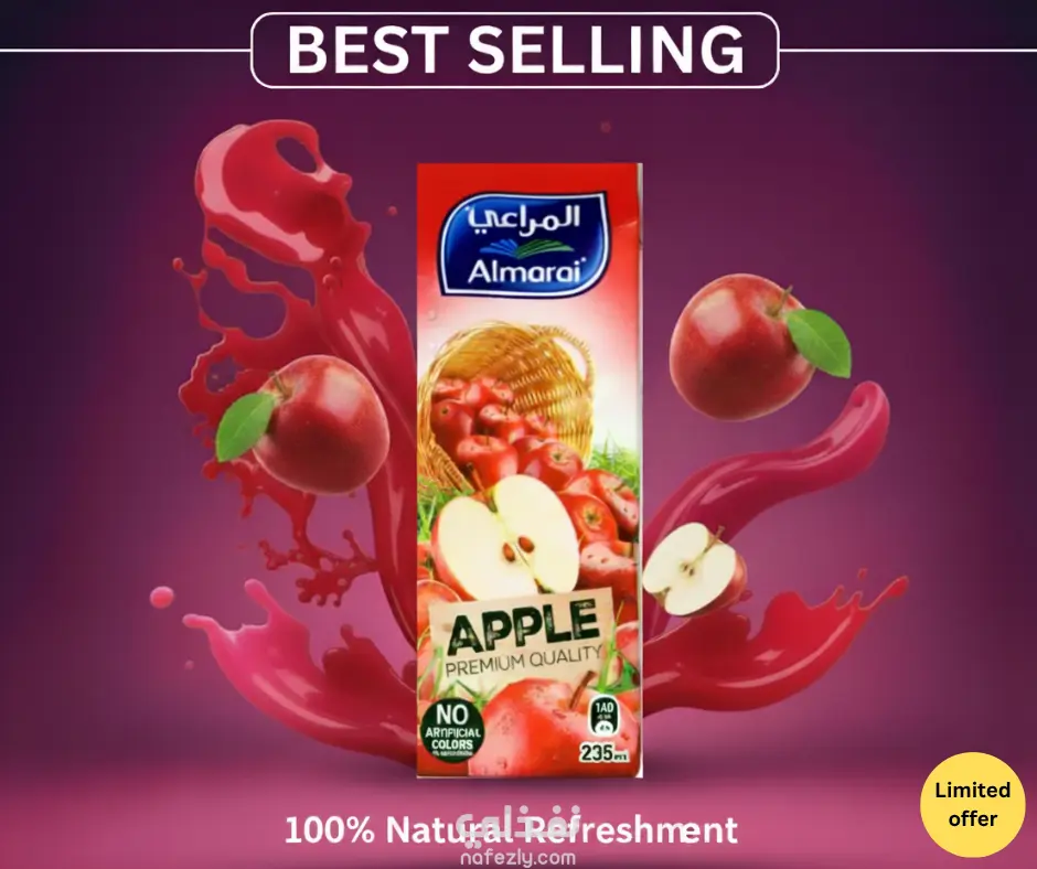 تصميم لعصير طبيعي بلون مشرق يوصل إحساس بالانتعاش. استخدمت حركة العصير والتفاح عشان تبين حيوية المنتج