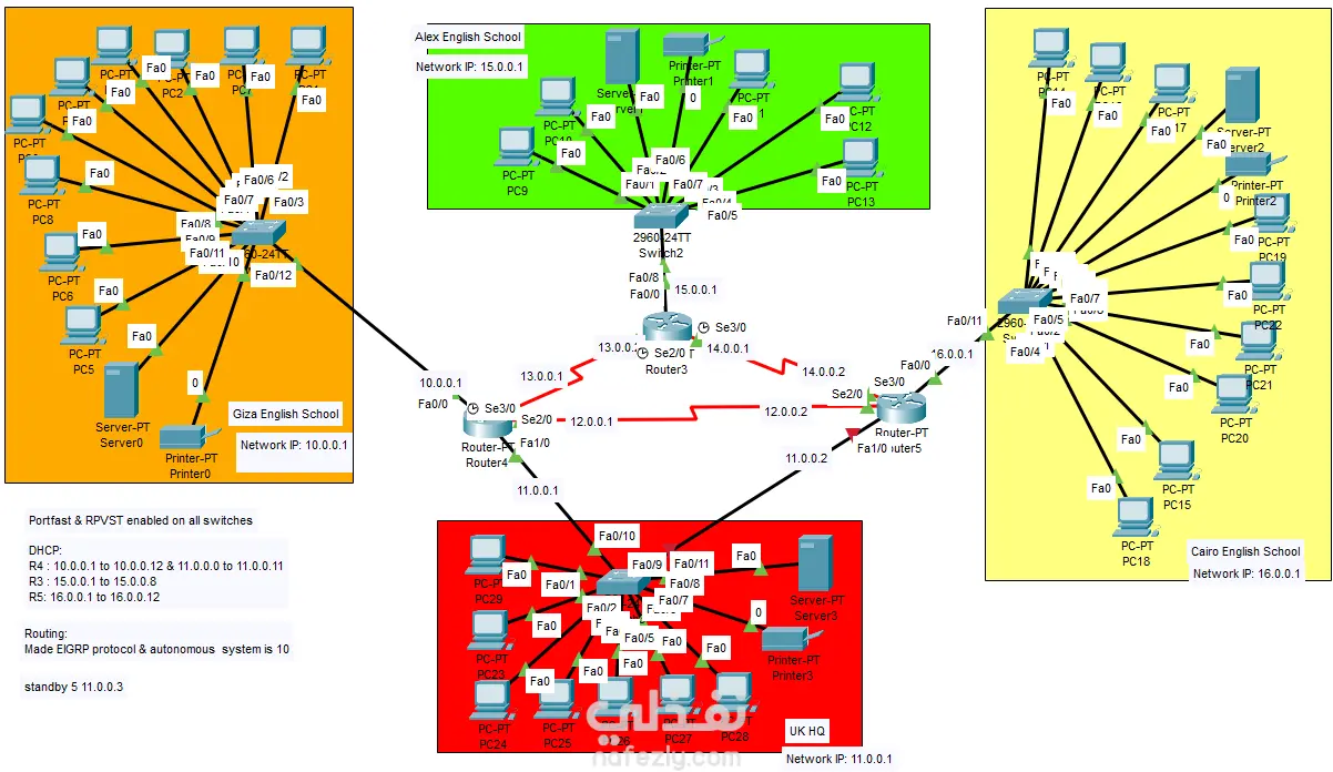 تم تصميم وتنفيذ بنية شبكة مدرسية مركزية تربط الحرم الرئيسي (المقر) بثلاثة فروع. تم تكوين بروتوكول OSPF لتحقيق التوجيه الفعال بين جميع المواقع، وبروتوكول PVST+ لمنع حدوث الحلقات وتحقيق التكرار، وبروتوكول PortFast لتوفير اتصال سريع في طبقة الوصول. تم تعيين عناوين IP ثابتة للأجهزة الحرجة (الطابعات، الخوادم) بينما تم استخدام DHCP لأجهزة الطلاب وأعضاء هيئة التدريس.