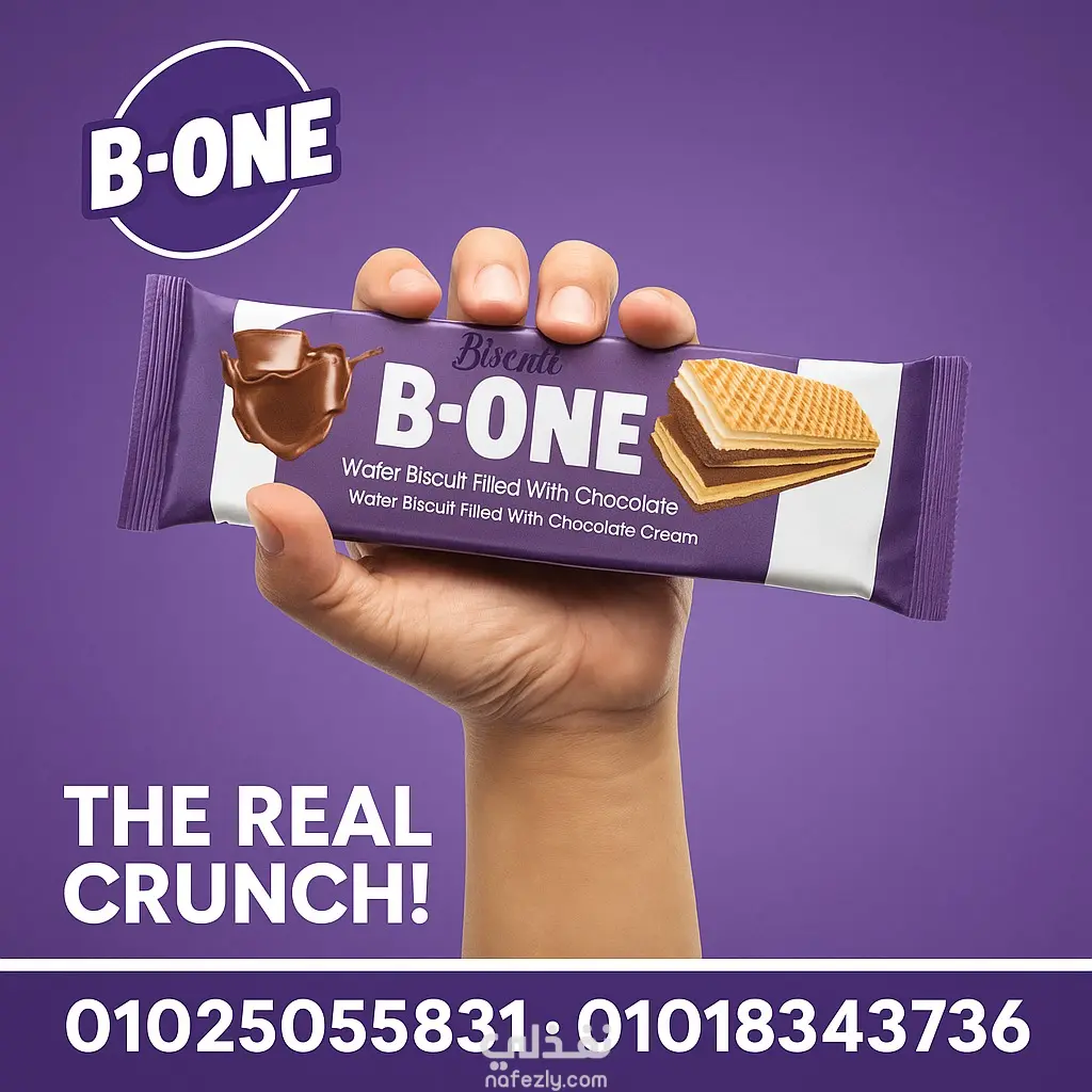 إعلان B-ONE يبرز بسكويت ويفر محشو بالشوكولاتة بطريقة جذابة. يركز التصميم على الطعم المقرمش والشوكولاتة الغنية. الخلفية البنفسجية تعزز هوية المنتج وتلفت الانتباه. العبارة "The Real Crunch" تؤكد على تجربة لذيذة ومميزة.