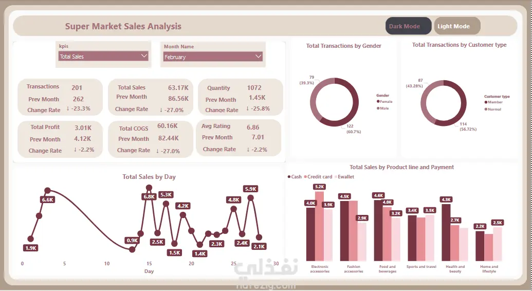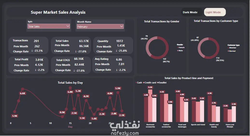 قمت بتصميم وتطوير لوحة معلومات ذكية ومُخصصة (Interactive Dashboard) لإجراء تحليل عميق وشامل لبيانات مبيعات متجر سوبر ماركت. كان الهدف هو تزويد الإدارة بأدوات لمراقبة الأداء الشهري، وتقييم مؤشرات الربحية، وفهم سلوك العملاء وطرق الدفع وتوزيع المبيعات حسب المنتجات.