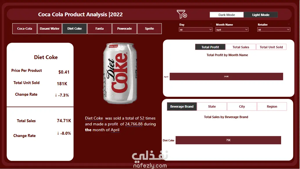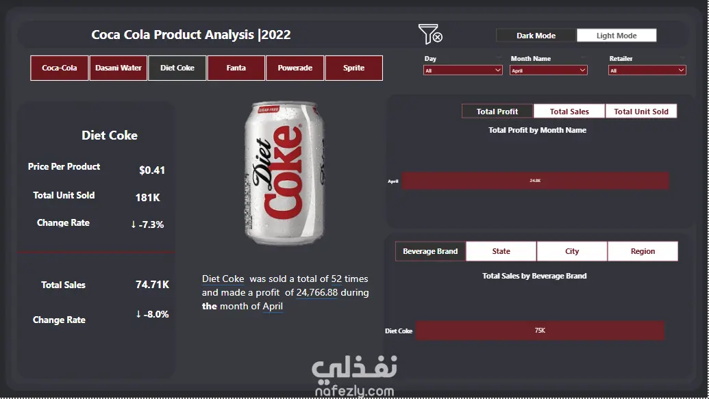 توفير واجهة سهلة الاستخدام تتيح للمستخدم التبديل بين المنتجات الأخرى في المحفظة (Coca-Cola, Dasani Water, Fanta, Sprite) والتحكم في عرض البيانات حسب اليوم، الشهر، والتاجر (Retailer).