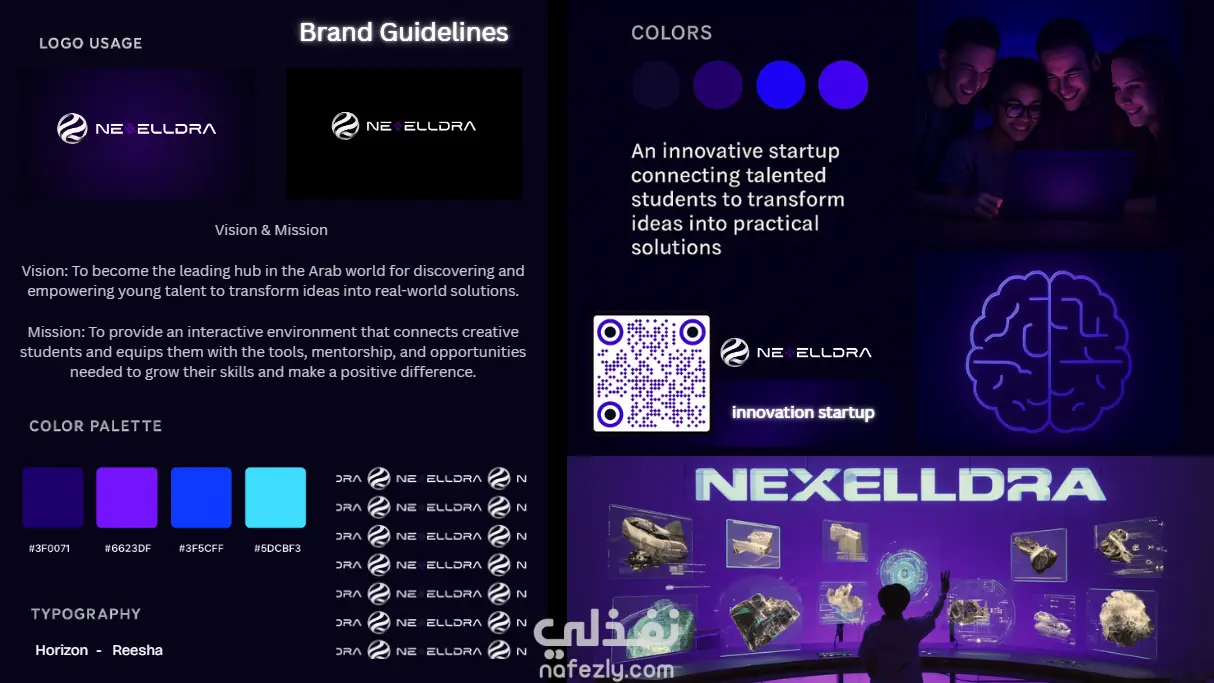 تم تصميم الهوية البصرية الكاملة لشركة Nexelldra، وهي شركة ناشئة مبتكرة تجمع بين التقنية والإبداع، وتهدف إلى تمكين الشباب الموهوبين من تطوير حلول لمشكلات المجتمع والعالم. الهدف من التصميم هو بناء هوية عصرية واحترافية تعبّر عن قيم الابتكار، التعاون، والرؤية المستقبلية. تم اختيار اللون البنفسجي والأسود النقي كلونين أساسيين لتمثيل القوة والتميز، مع لمسات من الأزرق والأبيض لإضافة الحيوية والوضوح. 🔹 تفاصيل المشروع: تصميم شعار حديث يعكس الابتكار والحركة نحو المستقبل. نظام ألوان وخطوط يعبران عن الطابع التقني والإبداعي للشركة. إعداد دليل هوية (Brand Guidelines) للاستخدام الموحد في كل المنصات. تطبيقات الهوية: بطاقات عمل، قوالب سوشيال ميديا، عروض تقديمية، ومواد دعائية. تعكس هذه الهوية جوهر Nexelldra ورسالتها في الدمج بين التكنولوجيا، الإبداع، والتأثير الاجتماعي ضمن مظهر بصري متكامل وقوي.