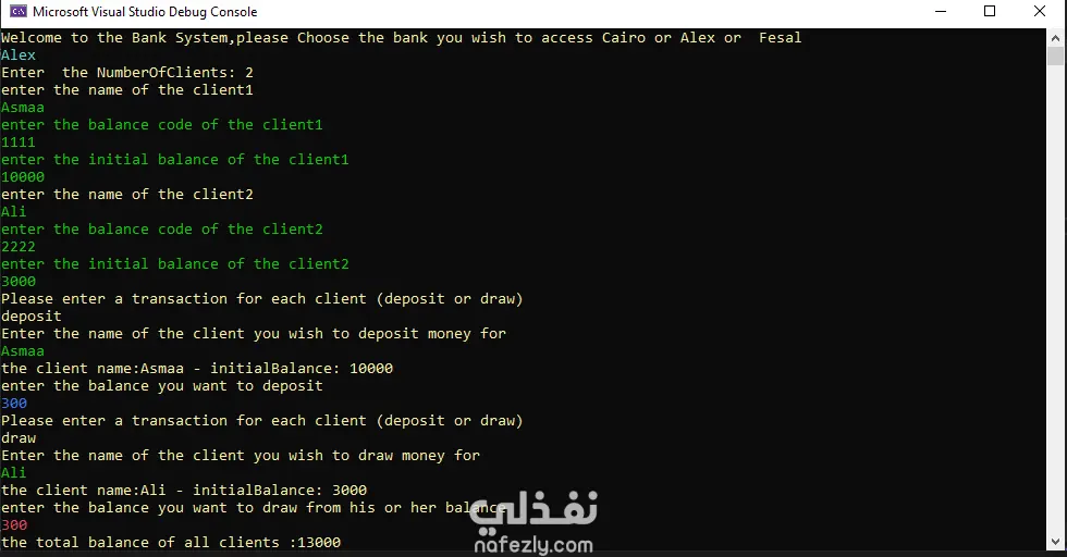 A simple Console application for managing a bank, performing the following tasks: Customer Data Management: Name ,Account Code ,Initial Balance Banking Operations: Deposit, Withdrawal Financial Calculations:,Total balance of all customers , Totalwithdrawals ,Total deposits Technologies Used :OOP ,Lists ,Console Colors for better UI