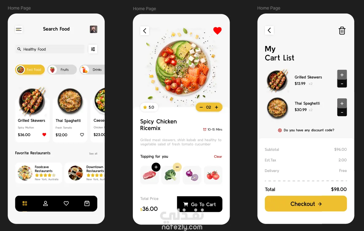 يتكون التصميم من ثلاث صفحات رئيسية: صفحة القائمة: تحتوي على عرض بصري جذّاب للأطباق مع صور عالية الجودة، وأسعار واضحة، وتصنيفات مثل "المقبلات"، "الأطباق الرئيسية"، "الحلويات"، و"المشروبات". يمكن للمستخدم النقر على أي طبق لعرض تفاصيله. صفحة تفاصيل الطبق: تُظهر مكونات الطبق، القيم الغذائية، الحساسية المحتملة، وخيارات التخصيص (مثل الإضافات أو إزالة مكونات معينة). تم تصميمها لتوفير كل المعلومات التي يحتاجها المستخدم قبل الطلب. صفحة الطلب: تتيح للمستخدم اختيار الكمية، إضافة الطلب إلى السلة، مراجعة الطلبات، وتأكيد عملية الشراء بسهولة. التصميم يراعي البساطة وسهولة التنقل، مع أزرار واضحة وخطوات منظمة.