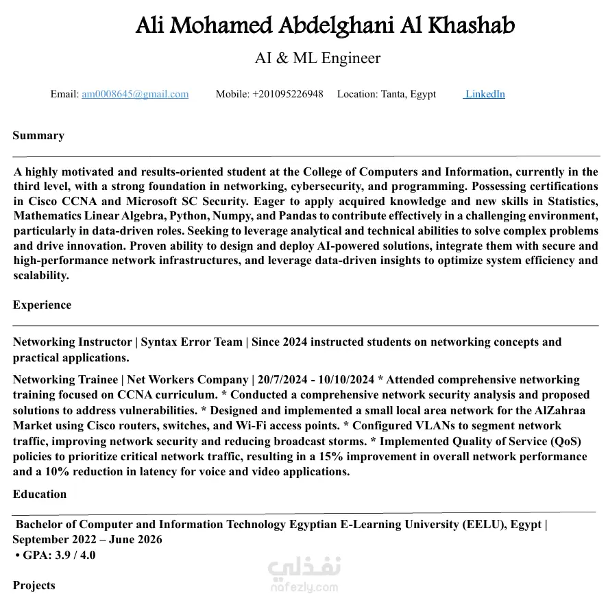 كتابة وتصميم سيرة ذاتية احترافية متوافقة مع نظام ATS، تم إعدادها بعناية لتناسب مجال العميل وتبرز خبراته ومهاراته بطريقة منظمة وجذابة